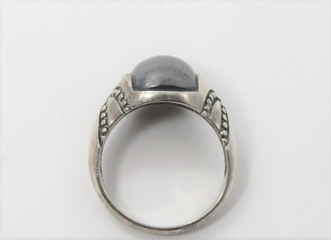 Sterling silver unisex ring, set with a flush, custom-cut hematite cabochon. This ring is size 8.5 and weighs 8.9g
