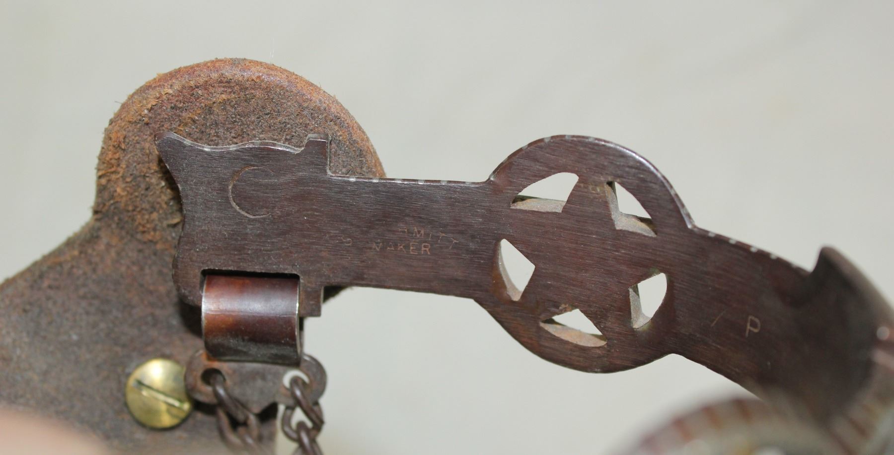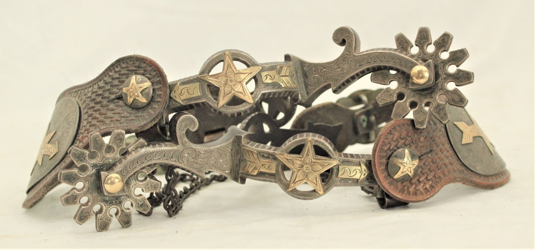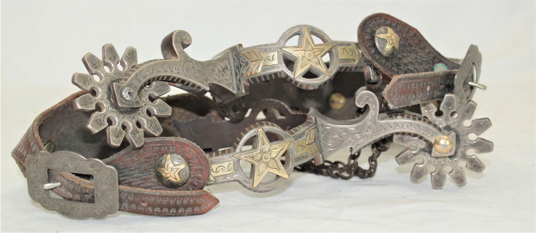 Stunning pair of double mounted spurs with a cut-out star and arrow motif, profusely detail engraved, with dazzling rowels and matching silver mounted straps.