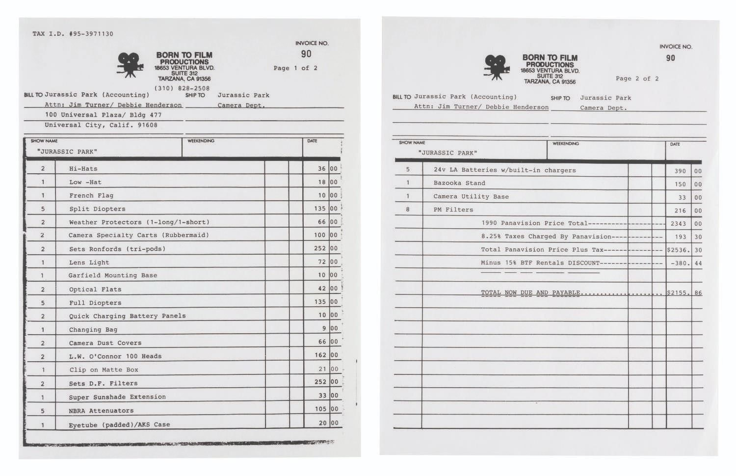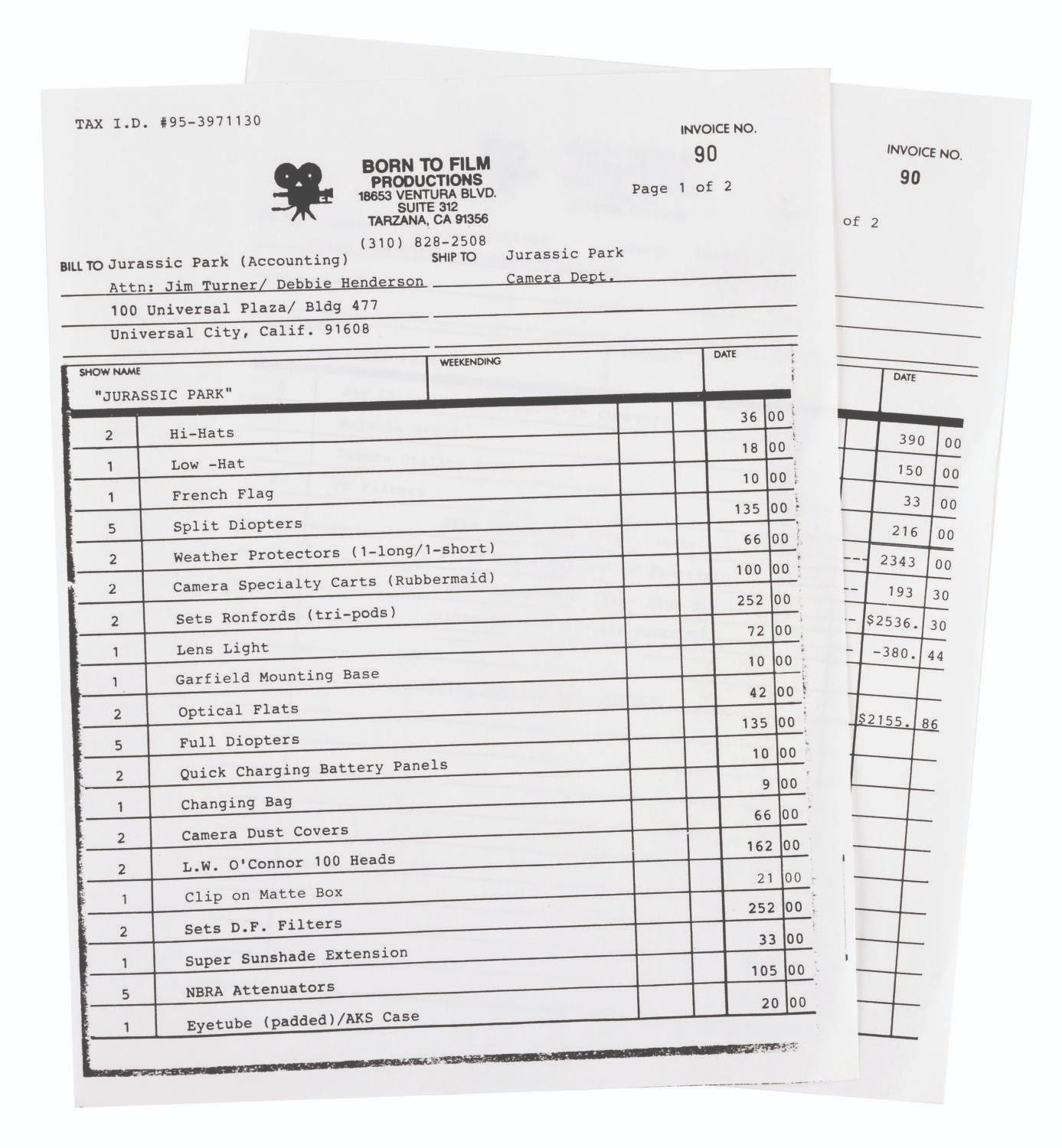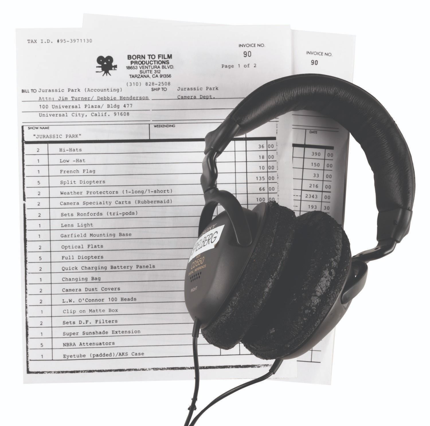 (Universal, 1993) Steven Spielberg’s Sony MDR CD550 headphones and a two-page Camera Department invoice from production of "Jurassic Park.” Measuring 6.5” x 5.5” x 8.5” tall, the headphones are in good condition with heavy material loss to the cushions, scuffs, and wear from production use, and the 8.5” x 11.5” two-page invoice is in very good condition with light creases and wear.