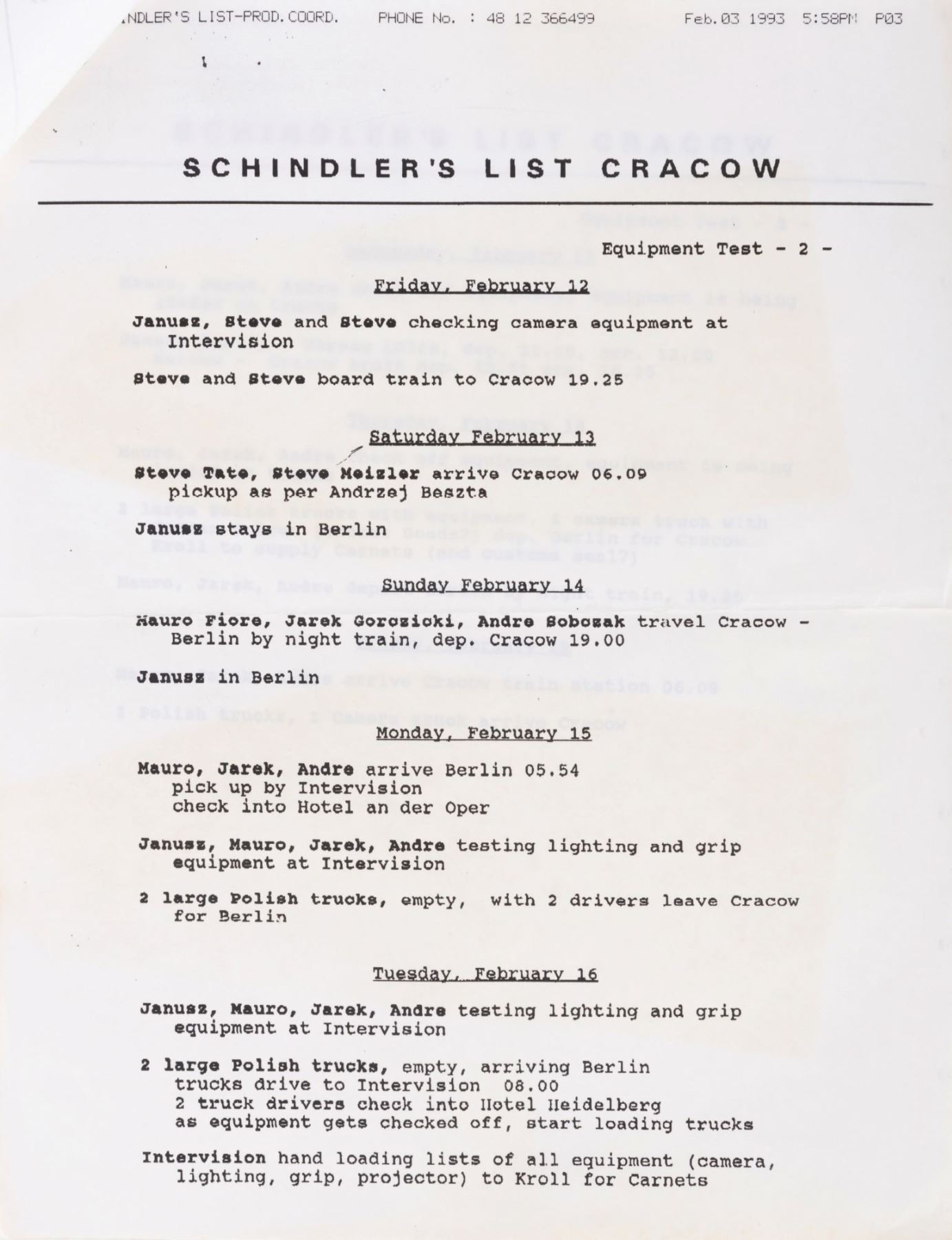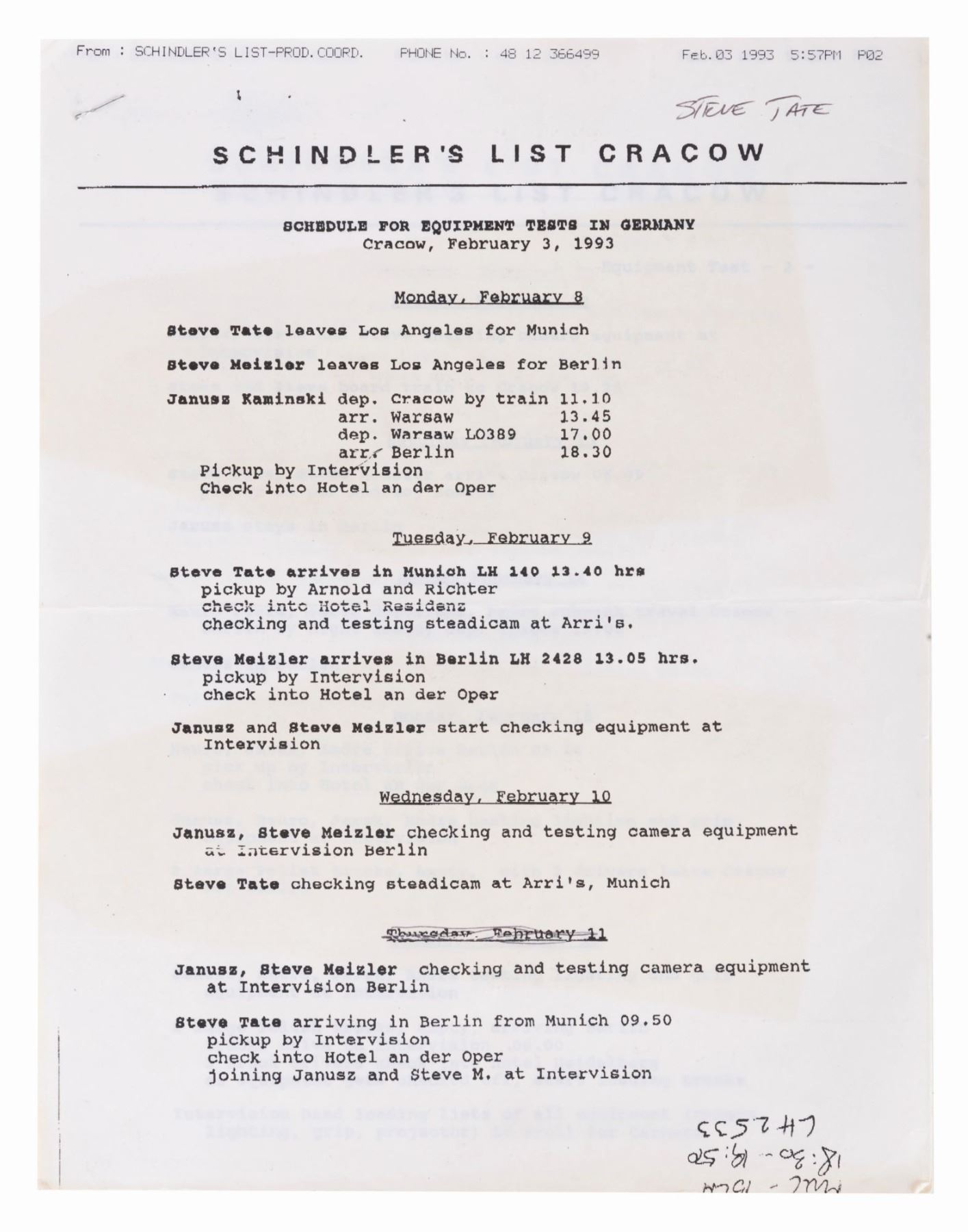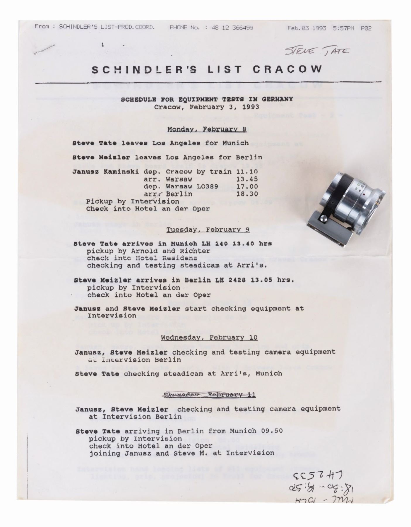 (Universal, 1993) Stephen Spielberg’s personal viewfinder and a memo from the production of "Schindler’s List.” Dated February 3, 1993, the memo outlines the schedule for an equipment test in Krakow, Germany. Measuring 1” x 1.5” and 1.25” deep, the viewfinder is in very good condition with light scuffs to the focus ring from production use, and the 8.5” x 11” memo is in good production-used condition with edge wear, discoloration, creasing, and a horizontal fold.