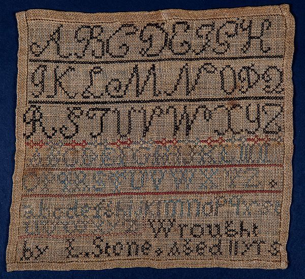 Stone, Lucy (1818-1893) American woman suffragist who lectured on women's rights and against slavery. She was the first woman from Massachusetts to graduate from college (Oberlin--a pioneering, co-educational college). She became a lecturer for the American Anti-slavery Society, and in 1850, organized a women's rights convention in Worcester, Mass. When Stone married Henry Blackwell (brother of Elizabeth Blackwell), she did not change her name, horrifying society; Stone and Blackwell founded and edited the American Woman Suffrage Association's weekly newspaper, Woman's Journal. Personal sampler of this remarkable woman, embroidered "Wrought by L. Stone--Aged 11 yrs," which establishes 1829 as the year it was created, 8 x 8 in., with large, upper-case alphabet and smaller upper and lower-case alphabet. A one-of-a-kind piece of history! Accompanied by a fine plate block of Lucy Stone U.S. 50-cent postage stamps.