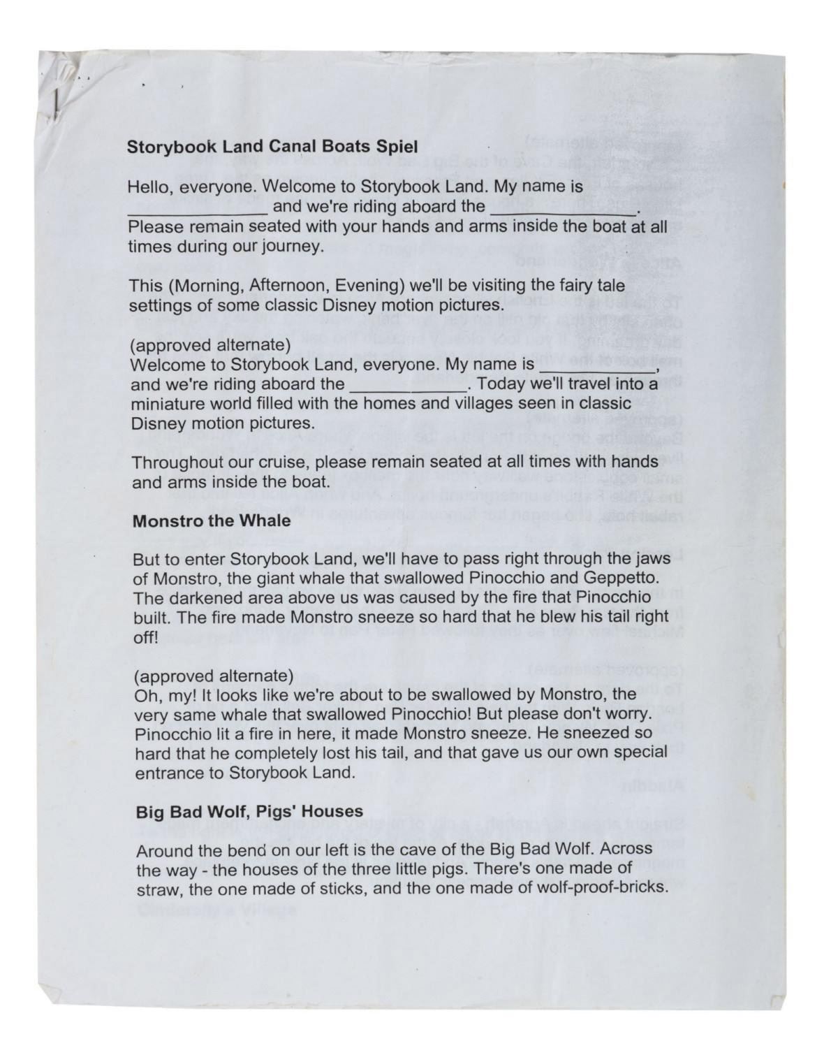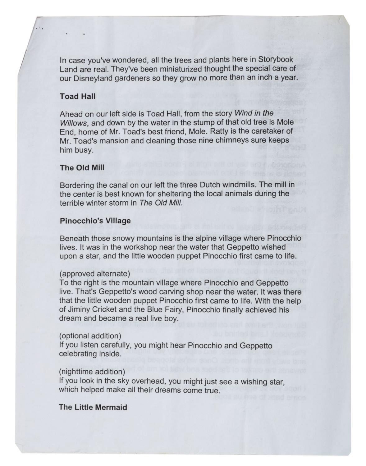 (Disneyland, c.1990s-2000s) A rare Cast Member script for the live narration heard during the Storybook Land Canal Boats attraction. The spiel highlights recently added landmarks like the Cave of Wonders, King Triton's Castle, Eric's Castle, and more. Measuring 8.5"x11", the 7-page dual-sided script is in fair condition, with creasing and edge wear throughout.