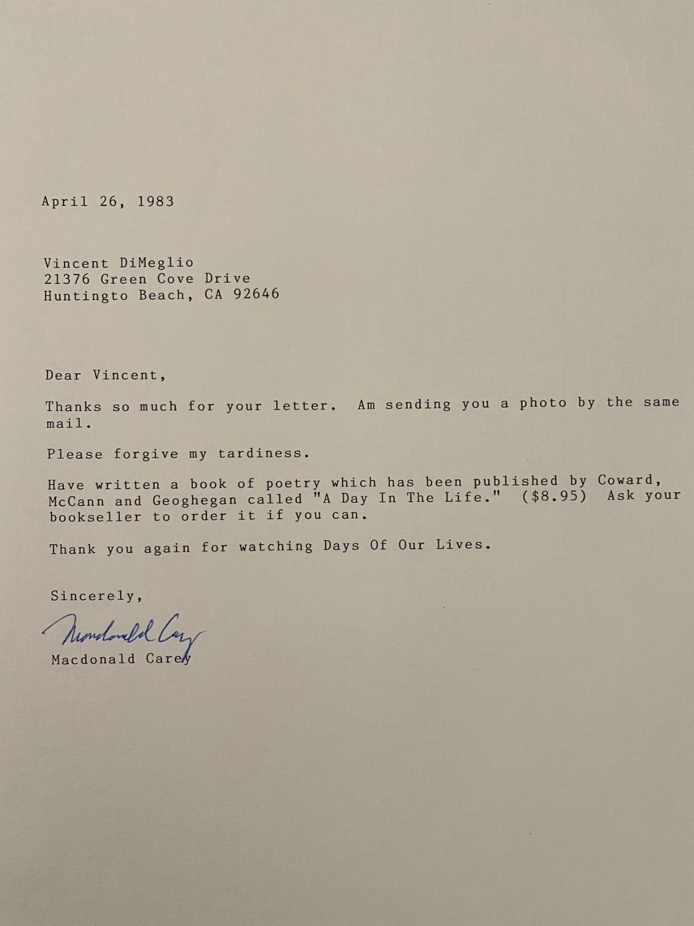 Macdonald Carey signed personal letter. 9 x 11 inches.