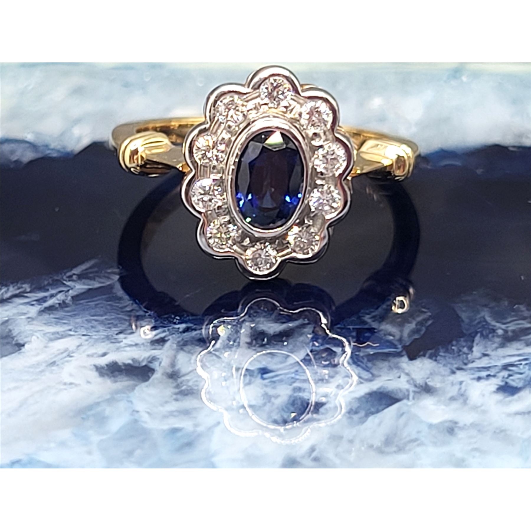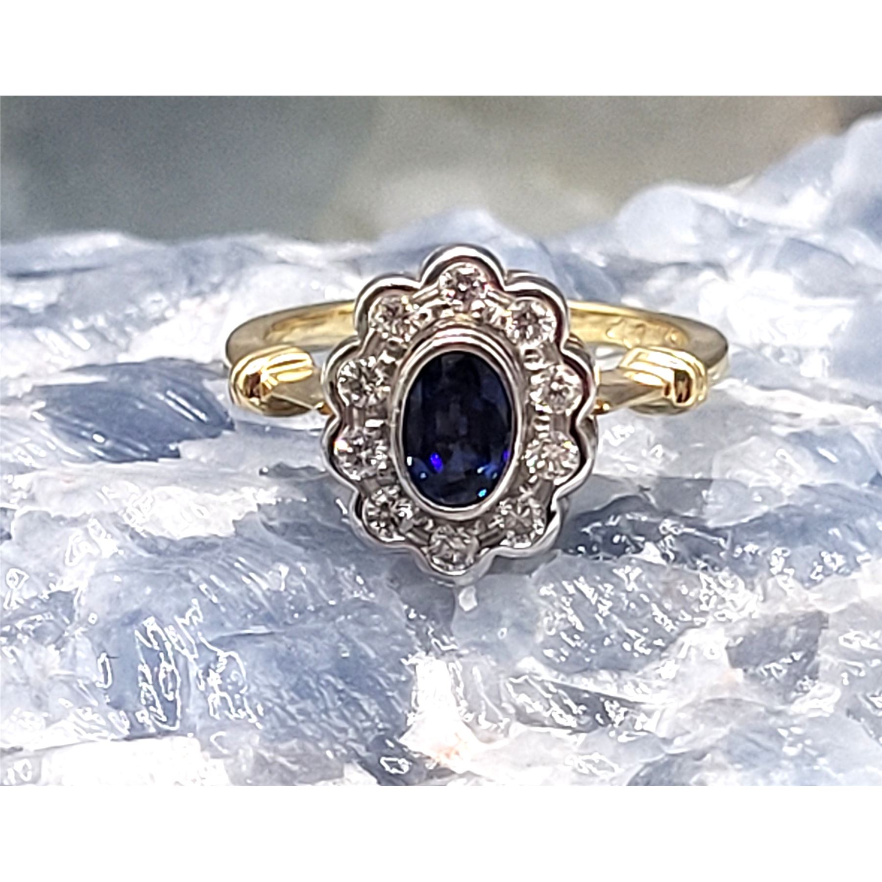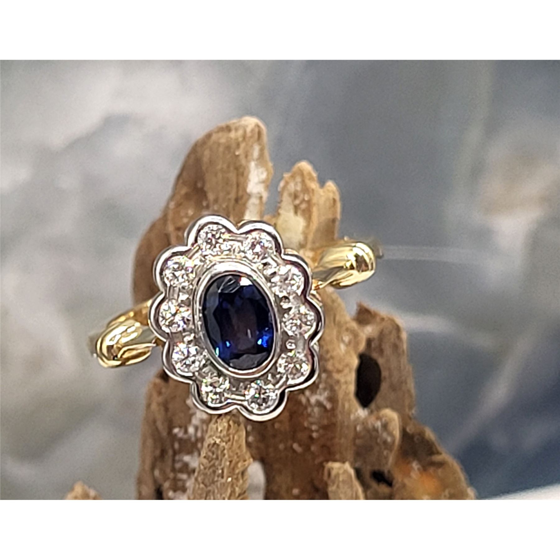 This is a 14 karat yellow and white gold ring that features an approximate .70 carat oval-cut, bezel-set, genuine midnight blue sapphire that is inside a scalloped halo of approximately .25 carats total weight round, brilliant-cut, approximate H color, SI2-I1 clarity diamonds. The setting and gallery are quite unique, in that the diamond halo is set in white gold above a separate unit of yellow gold and a petal-like gallery. The knife-edge shank and cathedral shoulders are adorned with a ribbed binding decor and taper to an approximate 2mm shank. The ring has a very solid feel and bears the & quot;S& quot; (Stuller) hallmark. It also bears the & quot;GB& quot; (Gordon Brothers) hallmark. This ring is US size 6 and can be sized for an additional charge. This item is eligible for appraisal by an independent appraiser (with qualifying credentials from GIA) without affiliation to Bidfair Fine Jewelry, at a discounted rate. Please contact Bidfair Fine Jewelry for more information on appraisals.& nbsp; Admin:33109/18lhe