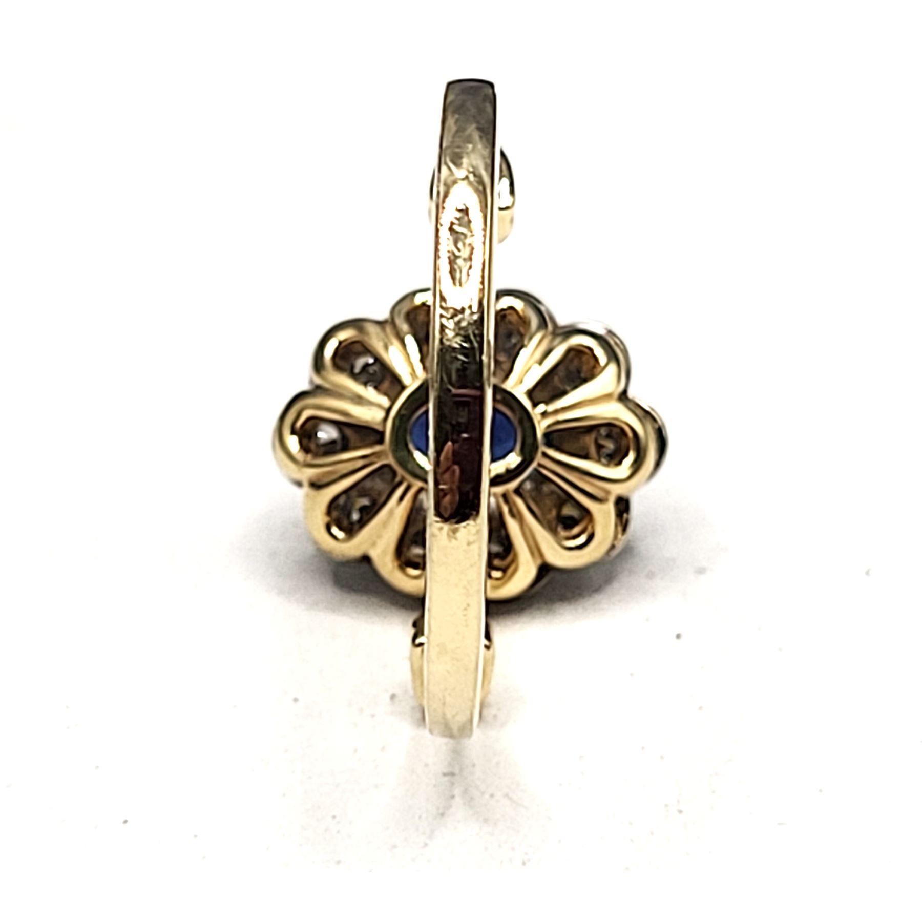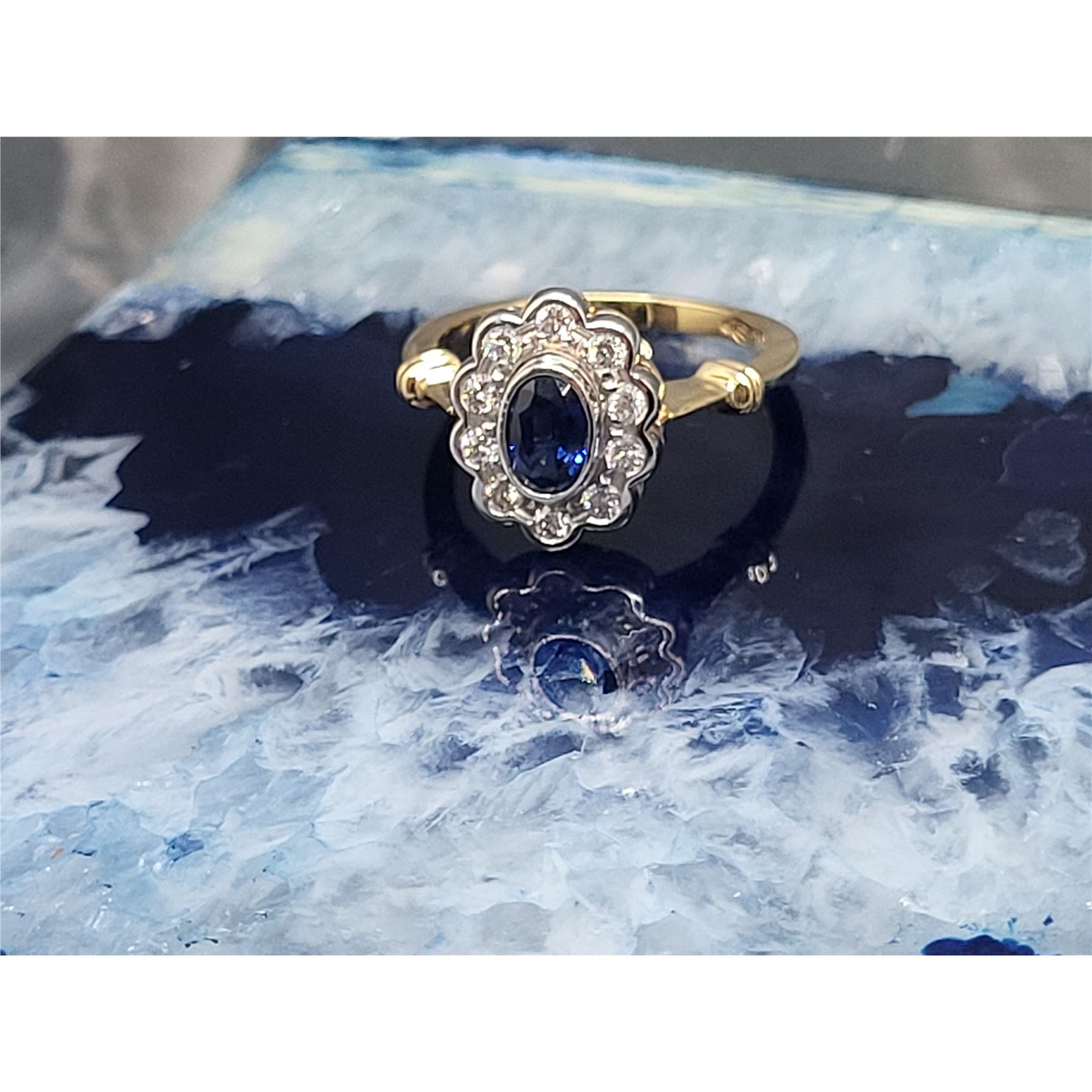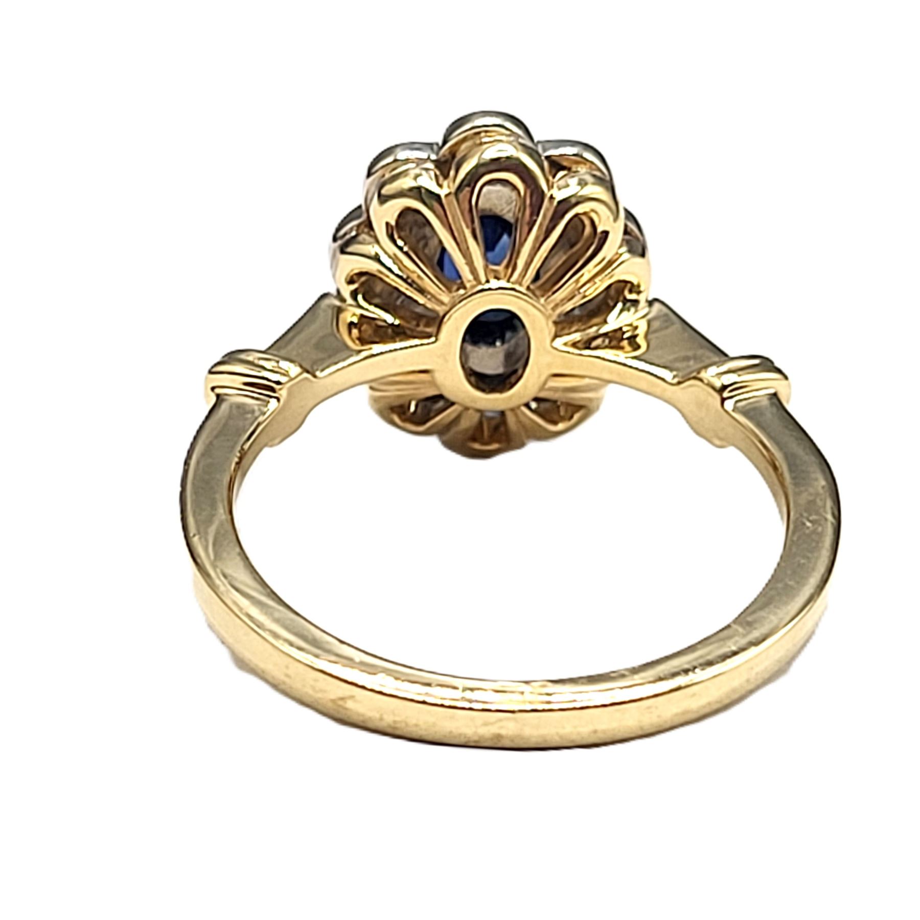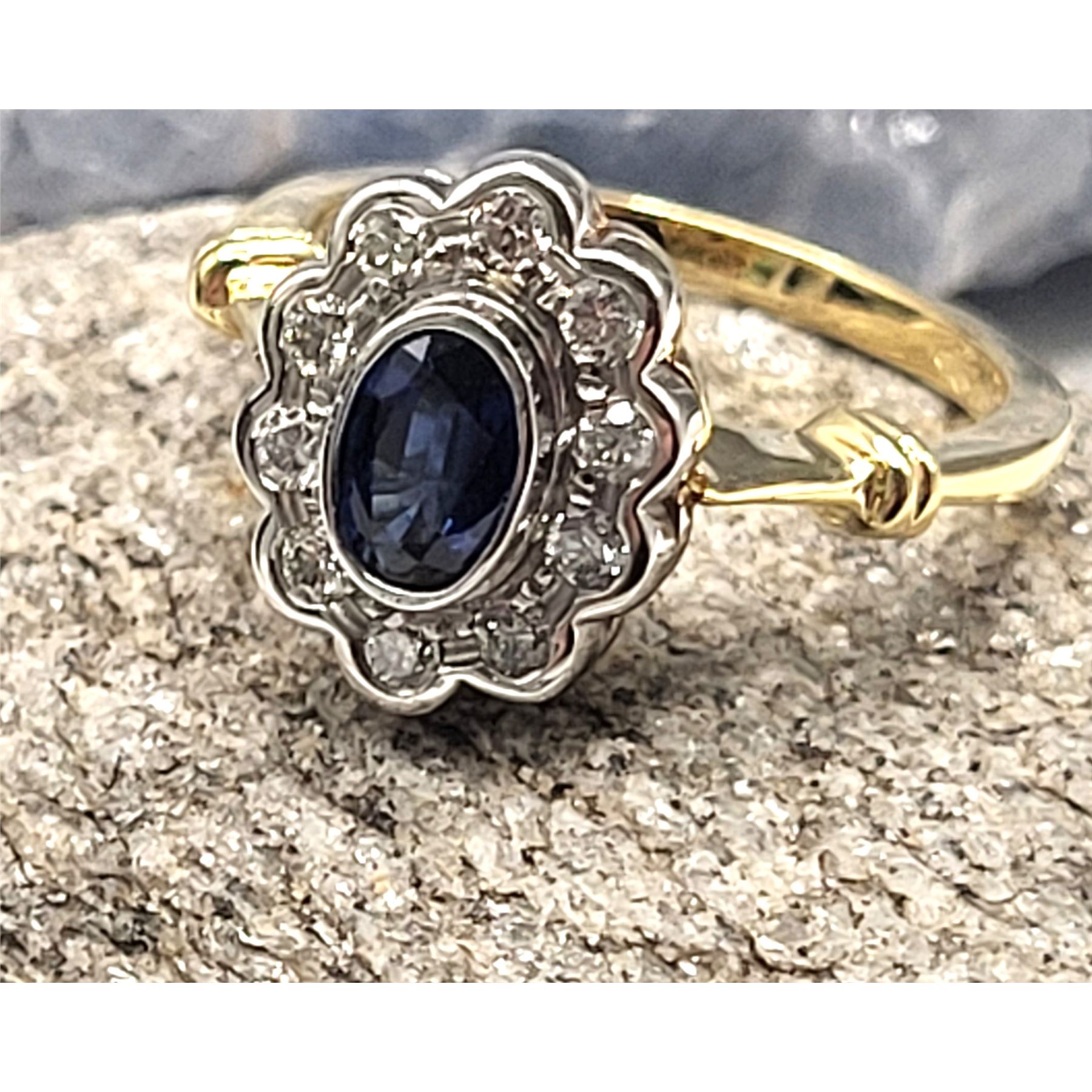 This is a 14 karat yellow and white gold ring that features an approximate .70 carat oval-cut, bezel-set, genuine midnight blue sapphire that is inside a scalloped halo of approximately .25 carats total weight round, brilliant-cut, approximate H color, SI2-I1 clarity diamonds. The setting and gallery are quite unique, in that the diamond halo is set in white gold above a separate unit of yellow gold and a petal-like gallery. The knife-edge shank and cathedral shoulders are adorned with a ribbed binding decor and taper to an approximate 2mm shank. The ring has a very solid feel and bears the & quot;S& quot; (Stuller) hallmark. It also bears the & quot;GB& quot; (Gordon Brothers) hallmark. This ring is US size 6 and can be sized for an additional charge. This item is eligible for appraisal by an independent appraiser (with qualifying credentials from GIA) without affiliation to Bidfair Fine Jewelry, at a discounted rate. Please contact Bidfair Fine Jewelry for more information on appraisals.& nbsp; Admin:33109/18lhe