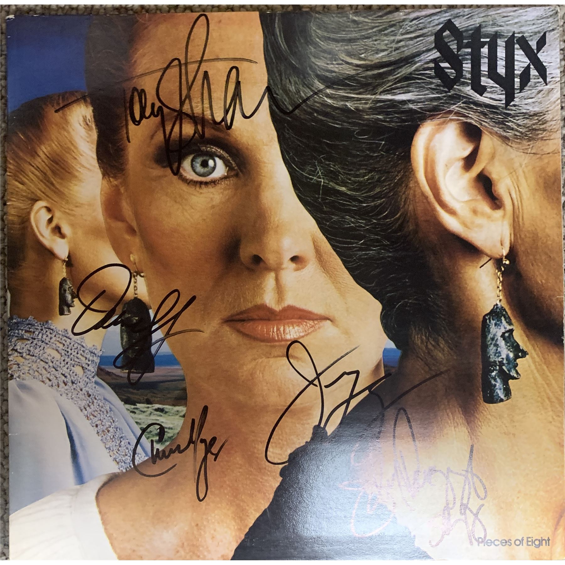 Styx Pieces of Eight signed album autographed by Dennis DeYoung, James Young, Tommy Shaw, Chuck Panozzo and John Panozzo. 12x12 inches. Vinyl included