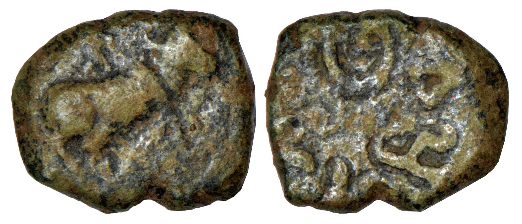 Rashtrakutas of Gujarat (Lata), unattributed copper coin, (700-800 AD), unpublished in major sources, 1.44g. Obv: Bull standing facing right. Rev: Circular Brahmi legend Shri Valla(bha) Raja…
