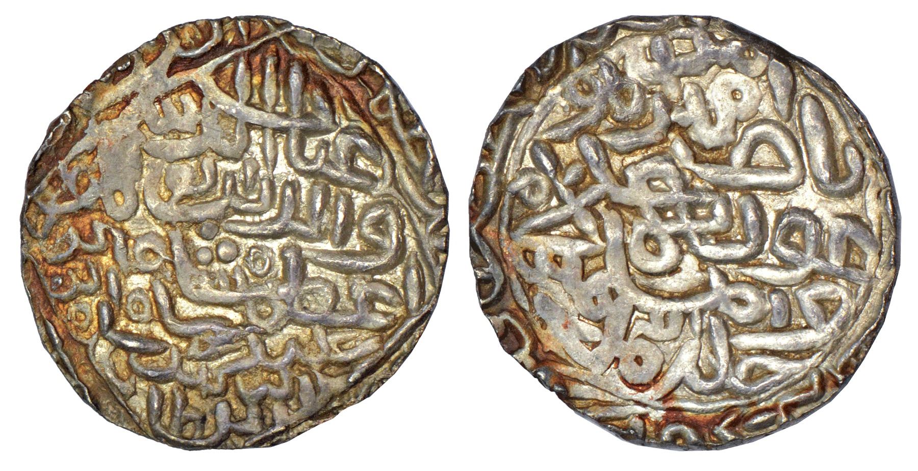 Sultans of Bengal, Silver tanka (pedigree) of Ghiyath al-Din A'zam (1389-1410 AD), Hadrat Firuzabad mint, G&G B242, 10.71g. Obv: Arabic legend ghiyath al-dunya wa'l din abu'l muzaffar a'zamshah ibn sikandar shah ibn ilyas shah al-sultan. Rev: Arabic legend nasir amir al-mu minin ghawth al-islam wa'l muslimin khallada allah mulkahu.