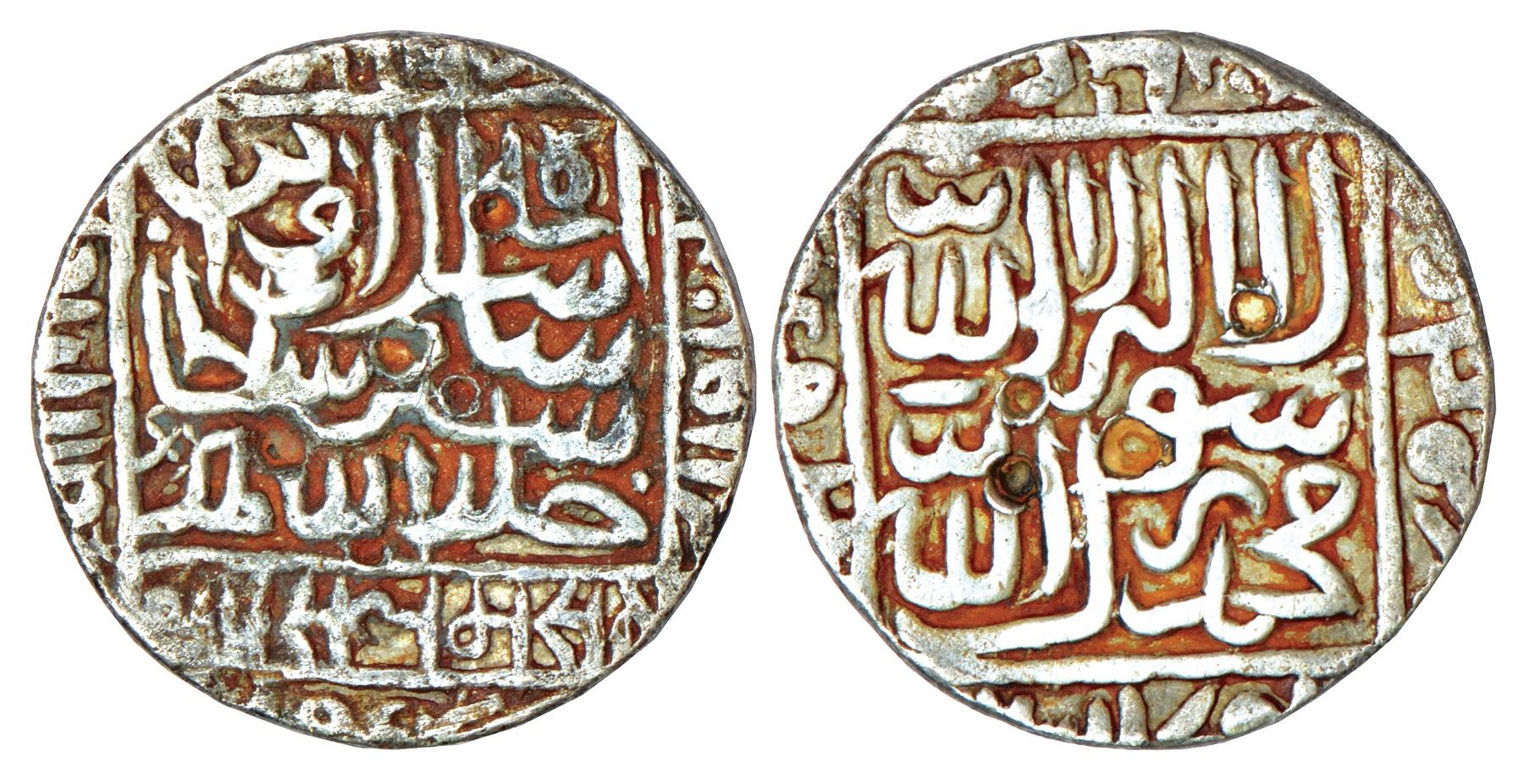 Sultans of Delhi - Suris, silver rupee of Islam Shah (1545-1552 AD), Qila' Raisen mint, AH 952, G&G D966, 10.90g. Obv: In rectangular border, Islam Shah bin Sher Shah Sultan Khallada Allah Mulkahu and Nagari legend Sri Isalamasahi; other titles around, date in the bottom margin. Rev: Shahada in rectangular border, names of Rashidoons in three margins and mint-name ba-Qila'a Raisen partly visible in bottom margin.