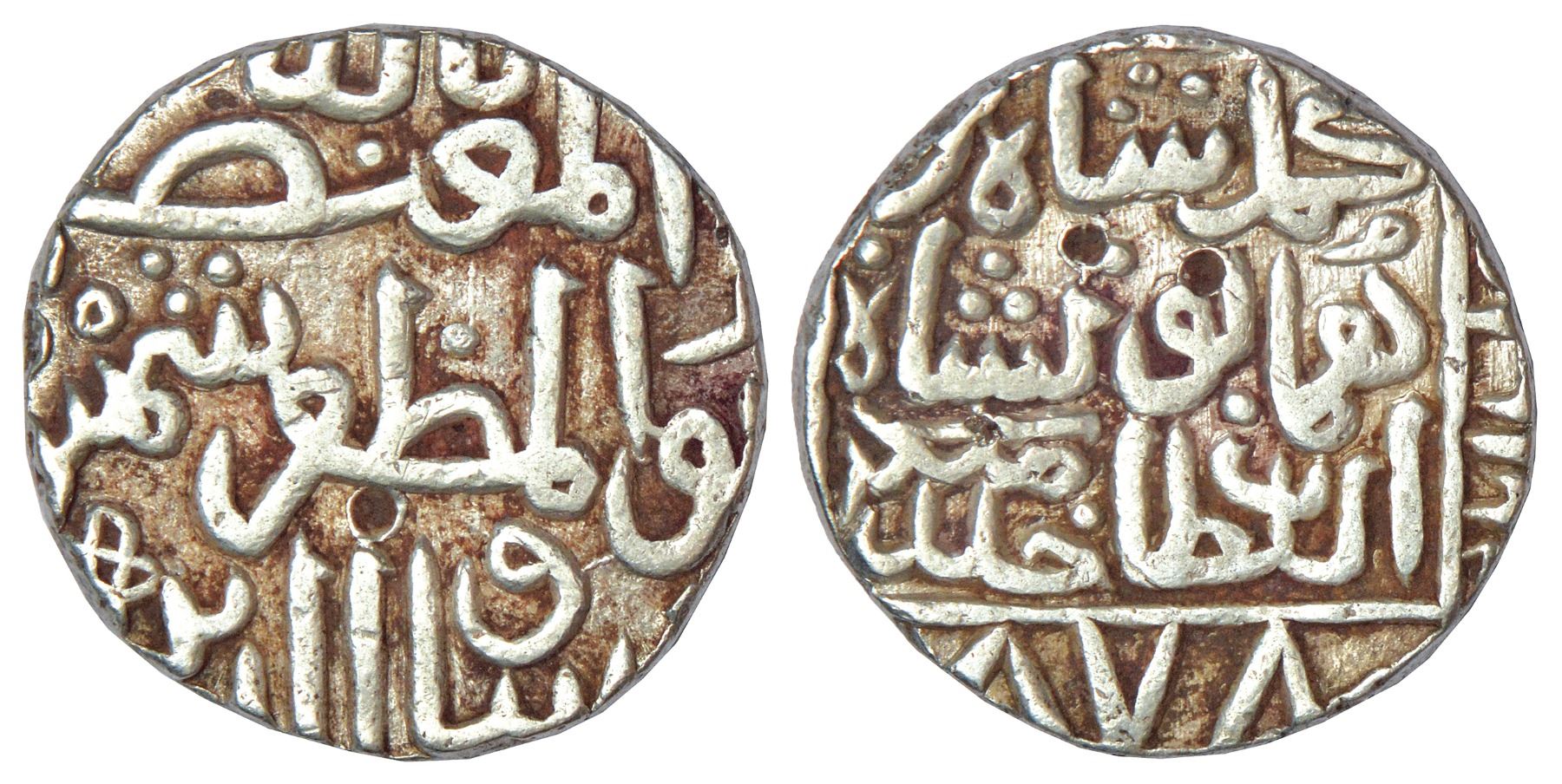 Bahmani Sultans of Gulbarga, Silver tanka of Shams al din Muhammad Shah III (1463-1482 AD), Hadrat Muhammadabad mint in right quadrant (partly visible), AH 878, G&G BH112, 10.99g.