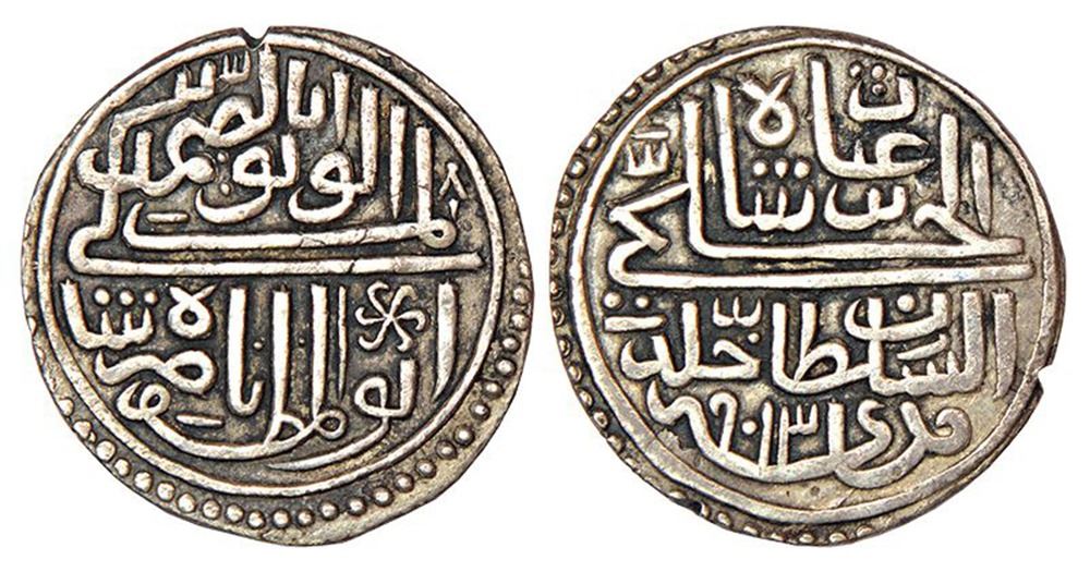 Sultans of Malwa, Specially struck (nazarana) silver tanka of Nasir Shah (1500-1510 AD), AH 913, G&G M126 (variety, listed as RRR), 10.48g. Obv: Arabic legend al-Wathiq b'al-Samad Lam Yazali Abu al-Muzaffar Nasir Shah. Rev: Arabic legend bin Ghiyath Shah al-Khilji al-Sultan Khallada Mulkahu. Edge slight knock,