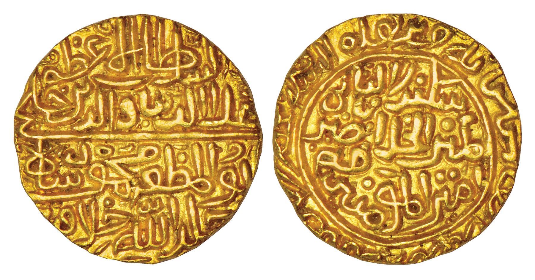 Sultans of Malwa, Ala al-Din Mahmud Shah I (1436-1469 AD), gold tanka, AH 872, Hadrat Shadiabad mint, 11.08g. Obv: Arabic legend al -Sultan al-'Azam 'Ala al-Dunyawa al-Din Abu al-Muzaffar Mahmud Shah Khalji Khallada Allah Khilafatahu. Rev: In circle, arabic legend Sikandar al-Thani Yameen al-Khilafah Nasir Amir al-Mumineen, mint & date details in borders, G&G M21.