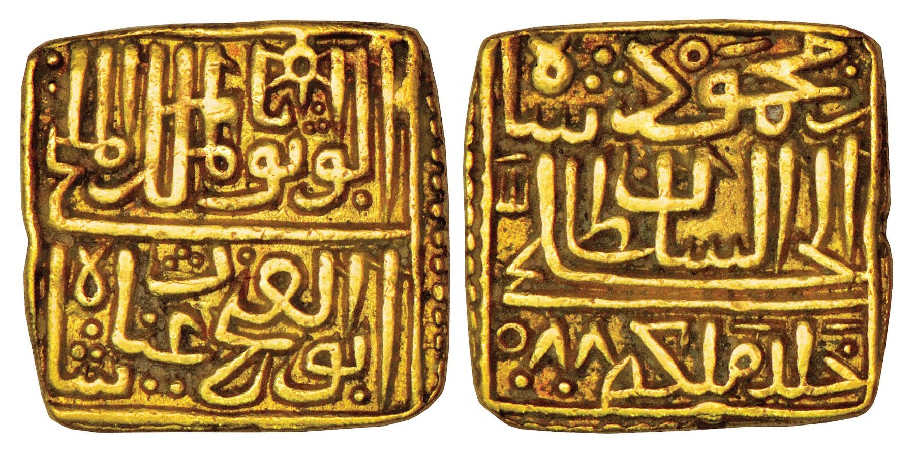 Sultans of Malwa, Ghiyath Shah (1469-1500 AD), gold square tanka, AH 880 (Retrograde), 10.93g. Obv: Arabic legend al-Wathiq bi'l Malik al-Multaji Abu'l Fath Ghiyath Shah, Sun mintmark. Rev: Arabic legend bin Mahmud Shah al-Khalji al-Sultan Khallada Mulkahu 880, G&G M66, test mark on edge.