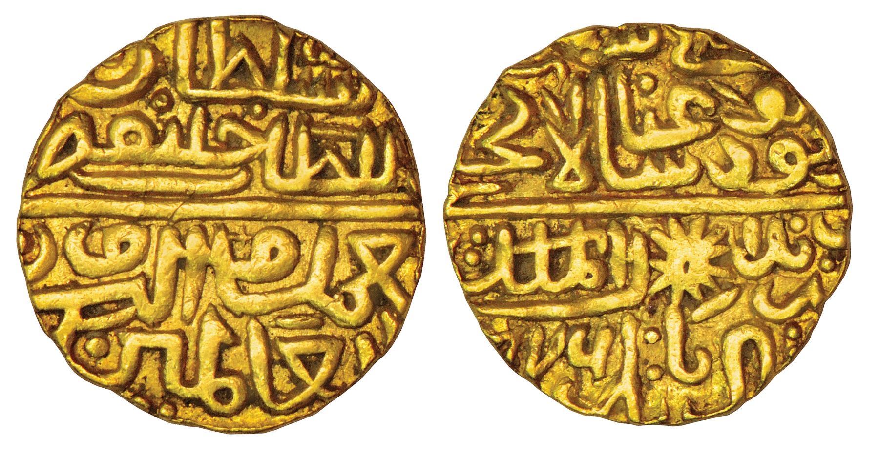 Sultans of Malwa, Ghiyath Shah (1469-1500 AD), gold tanka, AH 876, Dar ul-Mulk Shadiabad mint. 11.07g. Obv: Arabic legend al-Sultan bin al Sultan Khalifa al Zaman wa 'l ahd Fi al alamin. Rev: Arabic legend abu'l Fath Ghiyath Shah al-Sultani al-Khalji duribat bi -dar al mulk Shahdiabad, 876, star mintmark, G&G M61.