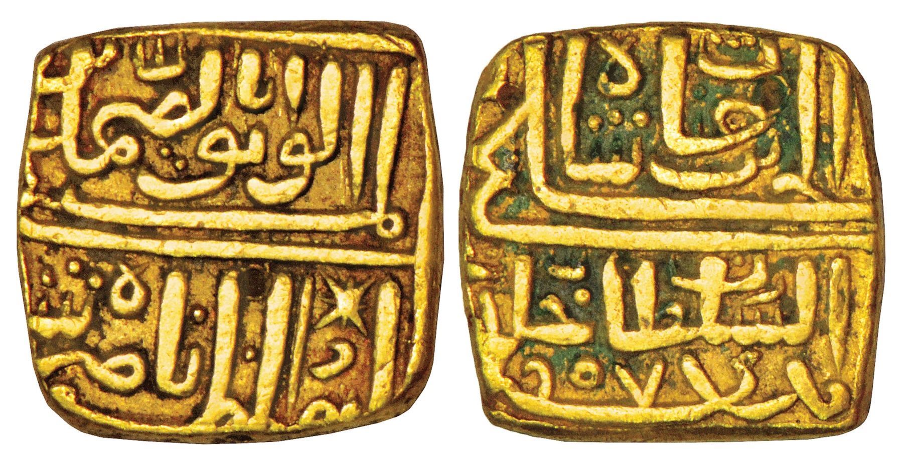 Sultans of Malwa, Nasir Shah (1500-1510 AD), gold square tanka, AH 907, 10.85g. Obv: Arabic legend al-Wathiq bi'l Samad lam Yazali Abu'l Muzaffar Nasir Shah. Rev: Arabic legend Ghiyath Shah al-Khalji al-Sultan Khallada Mulkahu, G&G M105.