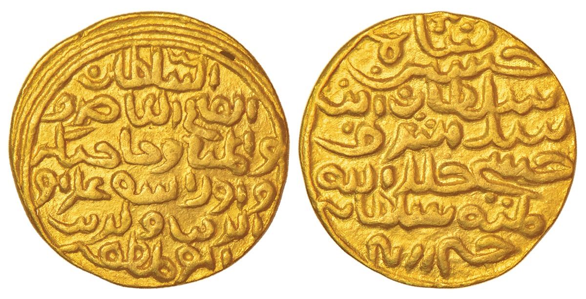 Sultans of Bengal, Gold tanka of Ala al-Din Husain Shah (1493-1519 AD), Husainabad mint, no date, G&G B728, 10.62g. Obv: Arabic legend al-sultan al-fatih al-kamru wa al-kamta wa jajnagar wa urisa ala al-dunya wa al-din abu al muzaffar. Rev: Arabic legend husain shah al-sultan ibn said ashraf al-husaini khallada allah mulkahu wa saltanahu husainabad.