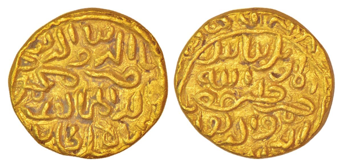 Sultans of Bengal, Gold tanka of Nasir ud-din Mahmud (1433/4-1459 AD), no mint type, 'abu'l mujahid' type, G&G B406, 10.94g. Obv: Arabic legend al mu'ayyad bi-ta'yid al-rahman khalifat allah bi'l hujjat wa'l burhan (vice-regent of God by proof and testimony). Rev: Arabic legend nasir al-dunya wa al-din abu'l mujahid mahmud shah al-sultan.