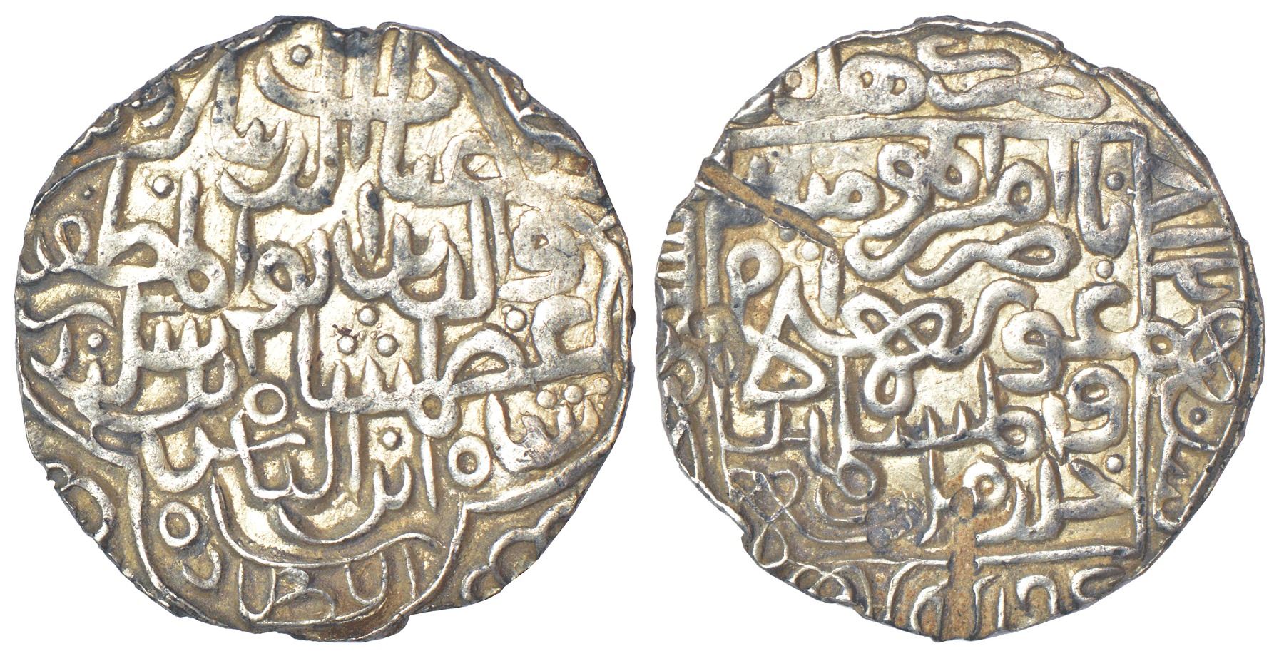 Sultans of Bengal, Silver tanka of Ghiyath al-Din 'Azam Shah (1389-1410 AD), Hadrat Firuzabad mint, AH 812 G&G B243, 10.70g. Obv: Arabic legend in Tughra calligraphy Ghiyath al-Dunya wa al-Din Abu al-Muzaffar 'Azam Shah bin Sikandar Shah bin Ilyas Shah in a four-lobed cartouche. Rev: Nasir Amir al-Mumineen Ghawth al-Islam wa al-Muslimeen in rectangle, mint and date in figures in the margins.