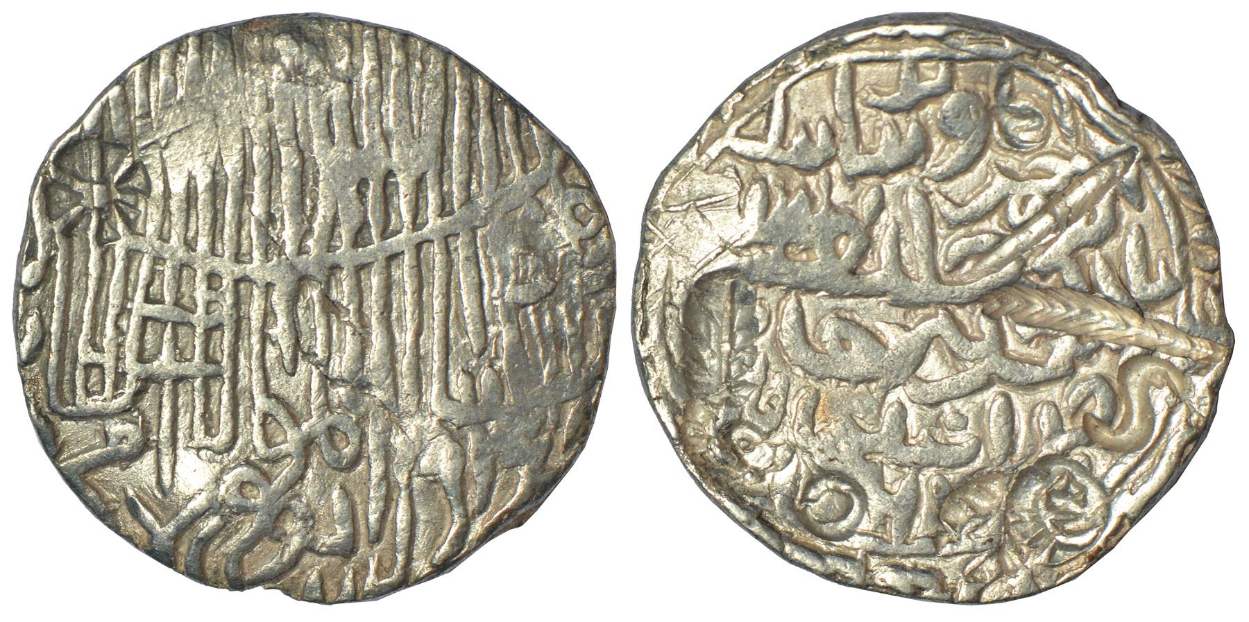 Sultans of Bengal, Silver tanka of Rukn al-Din Barbak Shah (1459-1474 AD), 'Tughra'-type, Khazana mint, AH 868, G&G B507, 10.52g. Obv: Arabic legend in Tughra calligraphy Rukn al-Dunya wa al-Din Abu al-Mujahid Barbak Shah al-Sultan bin Mahmud Shah al-Sultan. Rev: Arabic legend al-Muwayyad bi-Tayid al-Rahman Khalifath-Allah b'il-Hujjat wa al-Burhan followed by mint-name and AH date in numbers.
