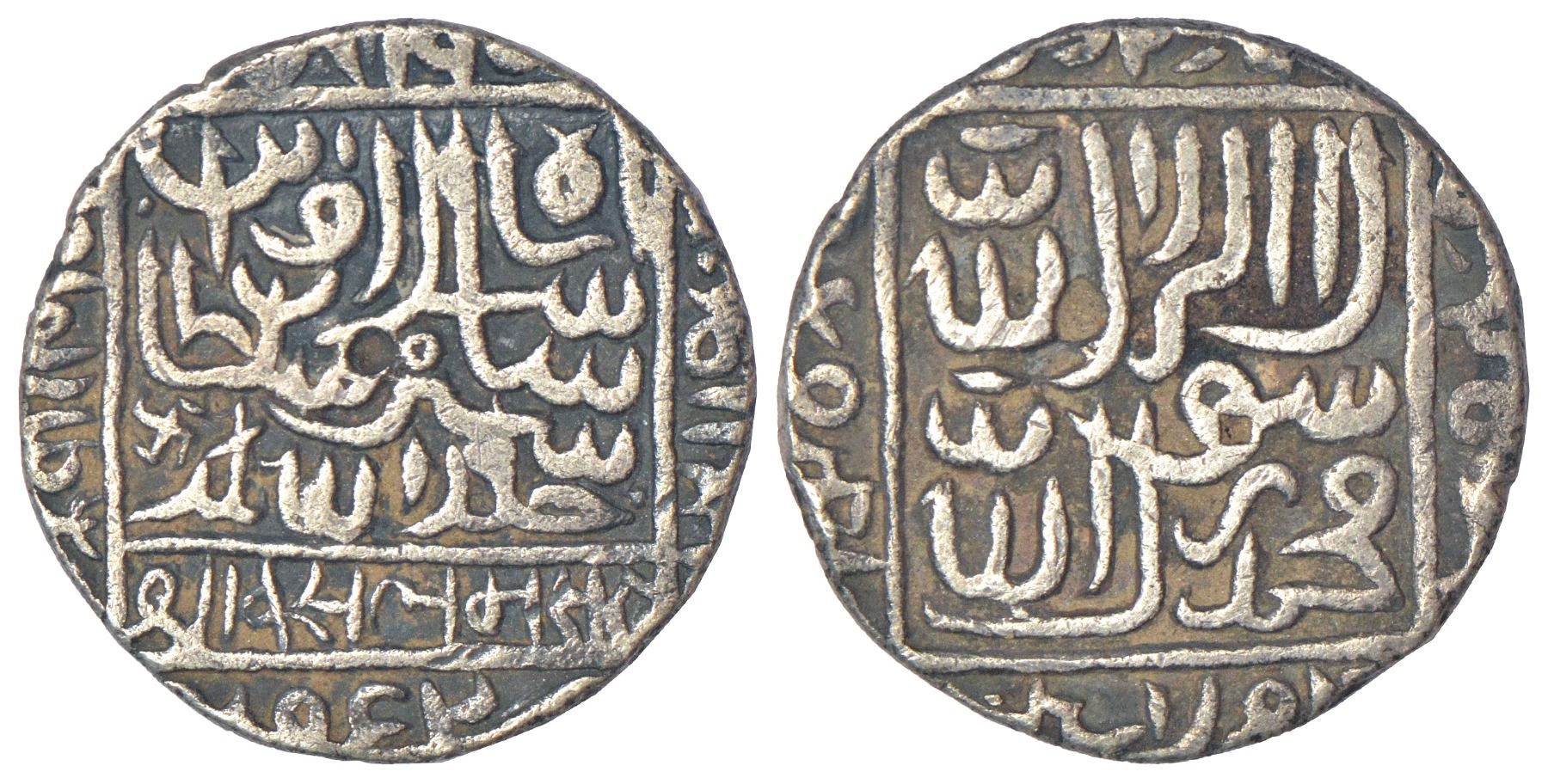 Sultans of Delhi, Suris, silver rupee of Islam Shah (1545-1552 AD), Qila' Raisen mint, AH 952, G&G D966 (listed as RRR), 11.13g. Obv: In rectangular border, Islam shah bin Sher shah sultan khallada allah mulkahu and Devanagari legend Sri Isalamasahi; other titles around, date in the bottom margin. Rev: Shahada in rectangular border, names of Rashidoons in three margin and mint -name ba-Qila'a Raisen in bottom margin.