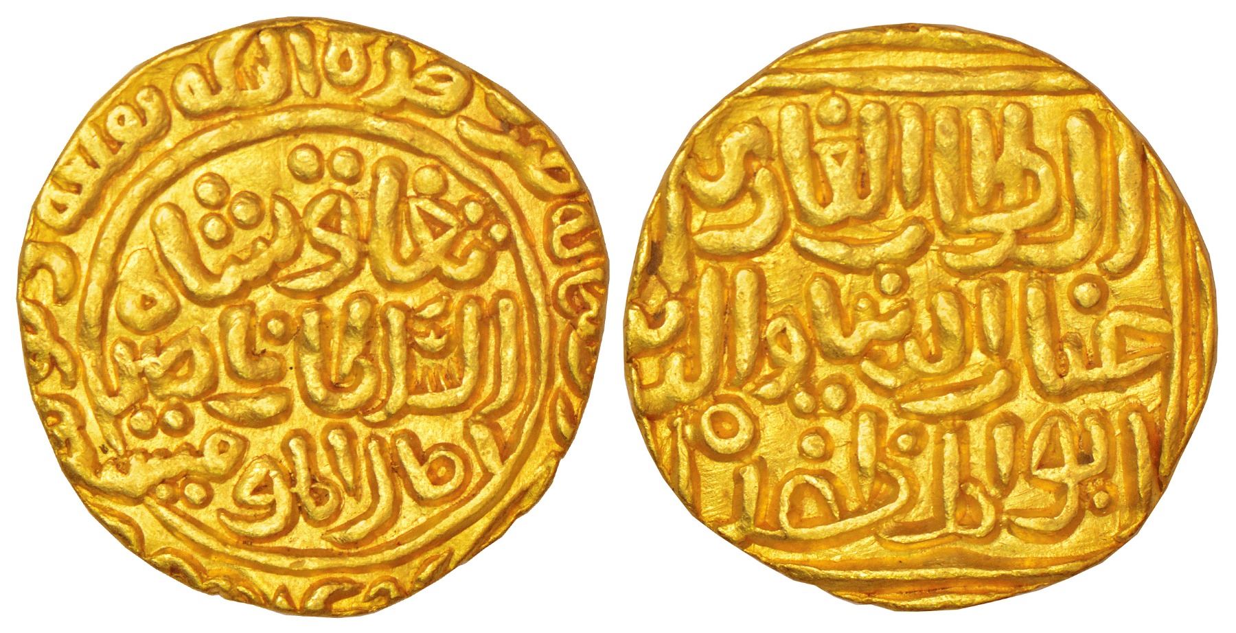 Sultans of Delhi, Tughluqs, gold tanka of Ghiyath al-Din Tughlaq (1320-1325 AD), Qila'a Deogir mint, AH 734, G&G D302, 10.94g. Obv: Sultan's name and title in circle; mint and AH date around. Rev: Sultan's laqab and kunyat in Arabic.
