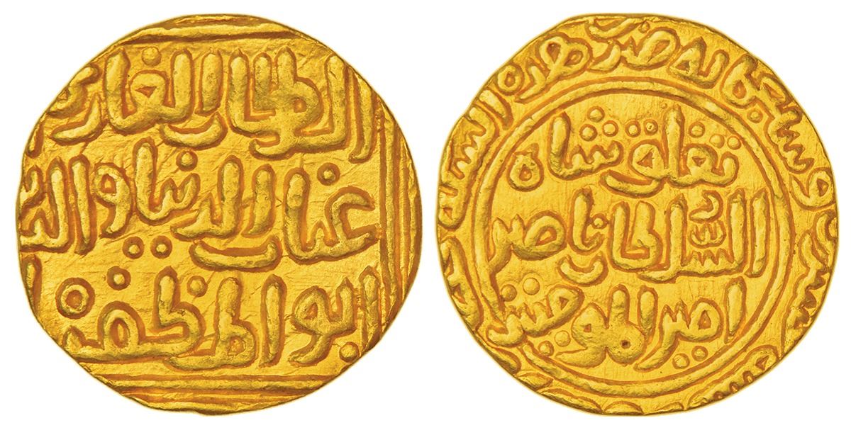 Sultans of Delhi, Tughluqs, gold tanka of Ghiyath al-Din Tughluq (1320-1325 AD), Hadrat Delhi mint, AH 720, G&G D301, 10.98g. Obv: Arabic legend al-sultan al-ghazi ghiyath al-dunya wa'l din abu'l muzzafar within double square. Rev: In circle, Arabic legend tughluq shah al-sultan nasir amir al mu'minin, date and mint details in the margin.