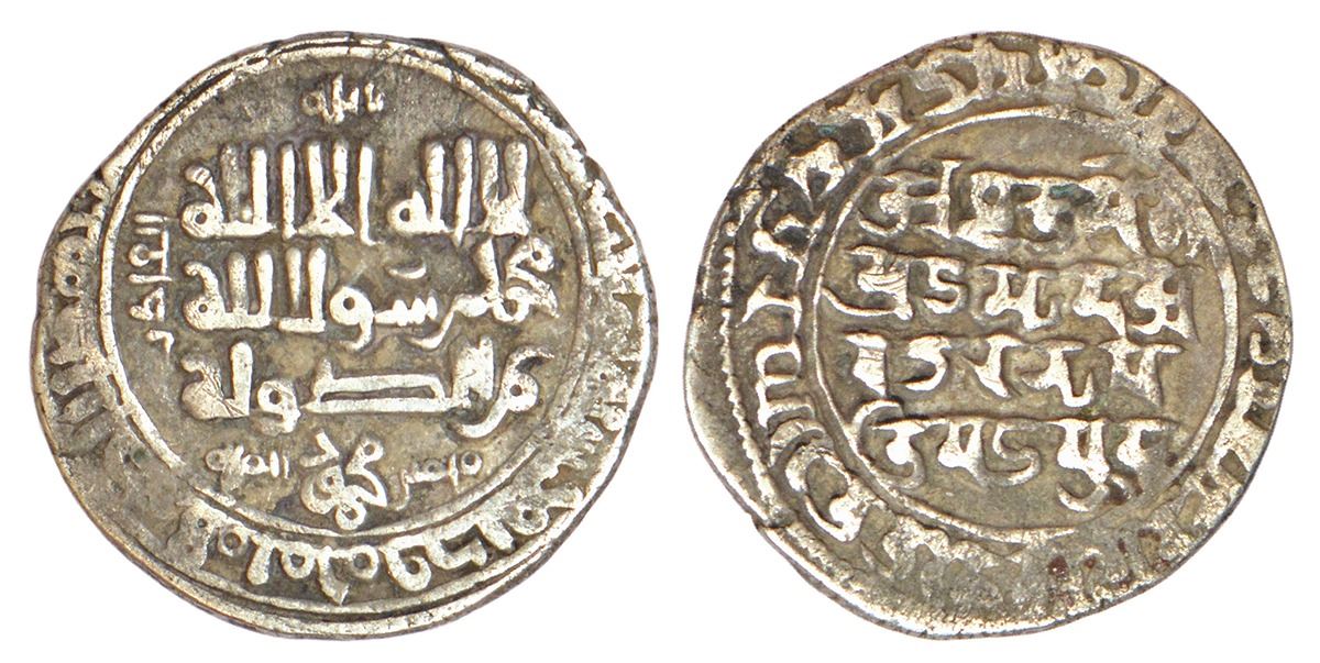 Sultans of Ghaznavids, Silver bilingual dirham of Mahmud Ghaznavi (998-1030 AD), Mahmudpur (Lahore) mint, AH 418/9 (1027-1029), G&G GZ5, 2.87g. Obv: legend in Arabic inscribed in Kufic script - Shahada followed by Yamin al-Daula wa Amin Mahmud al -Milla, to left al-qadir, above billah; AH date in words and mint-name in margin. Rev: legend in Sanskrit inscribed in Sharada script - Avyaktameka Muhammada Avatara Nripati Mahamuda ("the Invisible is One, Muhammad is the manifestation, Mahmud the king"); in the margins - Ayam Tankam Mahmudepure Ghatita Tajikiyer Samvati (“This coin was made in Mahmudpur in the Arab year”) followed by AH date in number.