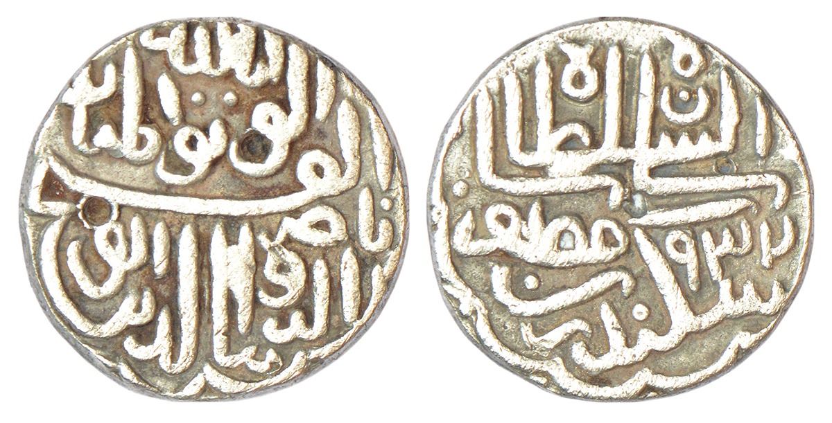 Sultans of Gujarat, Silver tanka of Nasir al-Din Sikandar Shah (1526 AD), AH 932, G&G G333 (listed as RRR), 6.46g. Obv: Within scalloped border, Arabic legend al-Wathiq Billah al-Mannan Nasir al-dunyawa al-din Abu al-Fatah within scalloped border. Rev: Arabic legend al-Sultan Sikandar Shah bin Muzaffar Shah 932 within scalloped border.