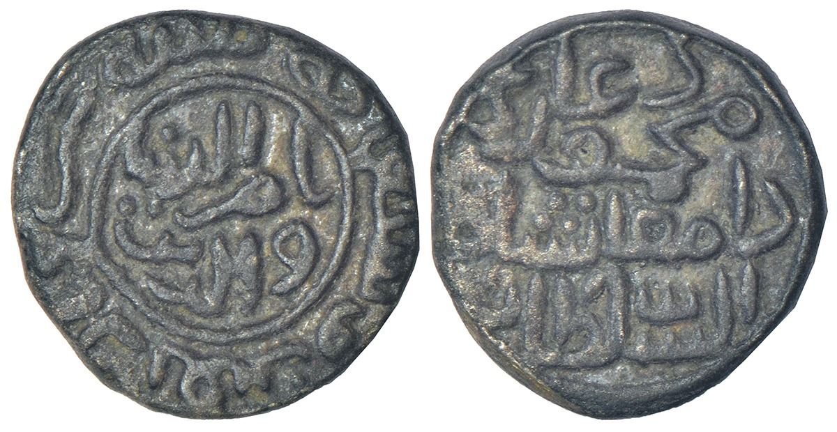 Sultans of Madura, Billon jital of Nasir al-Din Mahmud Damghan Shah (1344-1347 AD), AH 746, G&G MD18, 3.41g. Obv: Arabic legend nasir al-dunya wa'l din in circle, date in words around. Rev: Arabic legend Muhammad ghazi Damghan shah al-sultan.