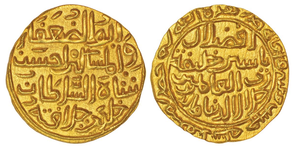 Sultans of Madura, Gold tanka of Jalal ud-din Ahsan Shah (1333/4-1339 AD), Hadrat Madura mint, AH 735, unlisted in G&G, 11.02g. Obv: Arabic legend abul za'afa'a wa'l masakin Ahsan Shah al-sultan khuldat khilafatahu. Rev: In center, Arabic legend afzal al-yaseen khalifat rubb al alamin jalal-ud-dunya wa'l din with AH date sab'mi'ah wa thalathin wa khams in words and mint name in margin.