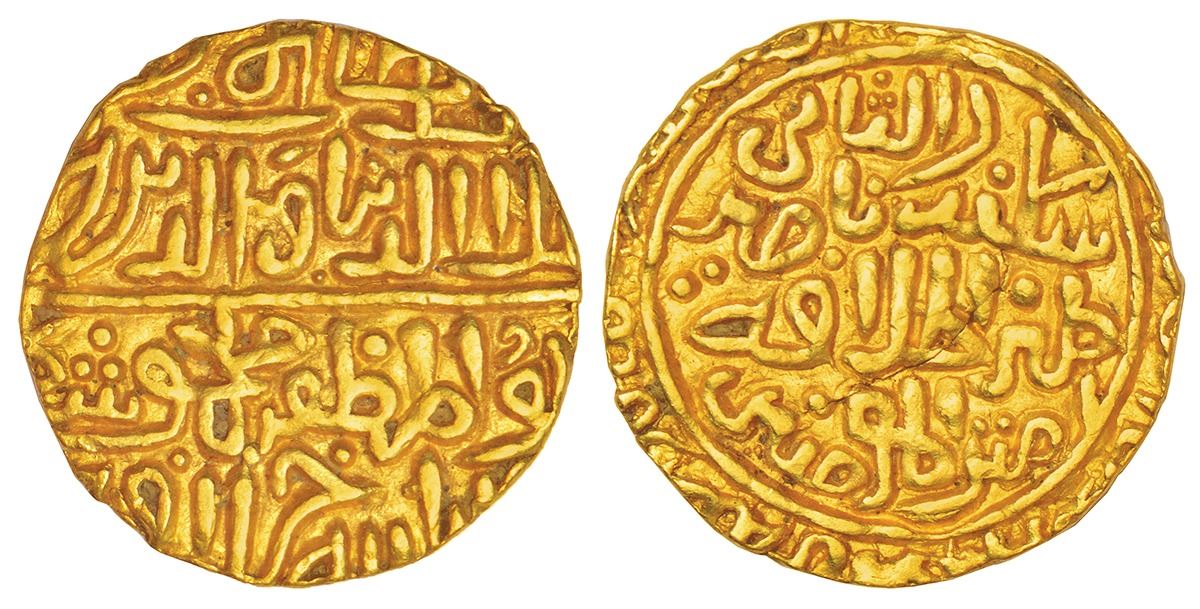Sultans of Malwa, Gold ½ tanka of Ala al-Din Mahmud Khalji (1436-1469 AD), Hadrat Shadiabad mint, date not clear, not listed in G&G and unique so far, 5.58g. Obv: Arabic legend al-Sultan al-Azam 'Ala al-Dunya wa al-Din Abu al-Muzaffar Mahmud Shah al-Khalji Khallada Allah Khilafatahu. Rev: Within a circle, Arabic legend Sikandar al-Thani Yamin al-Khilafah Nasir Amir al-Mumineen, date and mint details in margin.