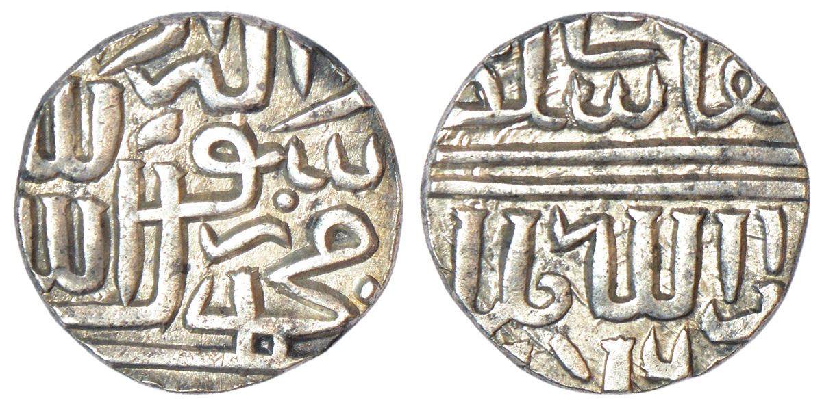 Sultans of Malwa, Silver tanka of Baz Bahadur (1555-1561/2 AD), G&G M241, 7.00g. Obv: The Kalima Shahada. Rev: Arabic legend abu'l muzaffar baz bahadur shah sultan khallada allah mulkahu wa sultanahu.