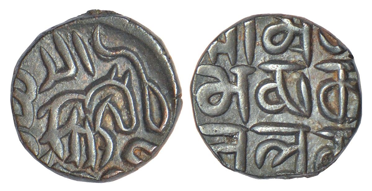 Sultans of Sind, Qarlughid dynasty - copper Jital of Nasir al-Din Muhammad Qarlugh (1249-1259 AD), G&G SS14, 3.50g. Obv: horse walking to right, Arabic legend Nasir al-Dunya wa al-Din around. Rev: Sharada legend Sri maha/mada ka/raluka in three lines.