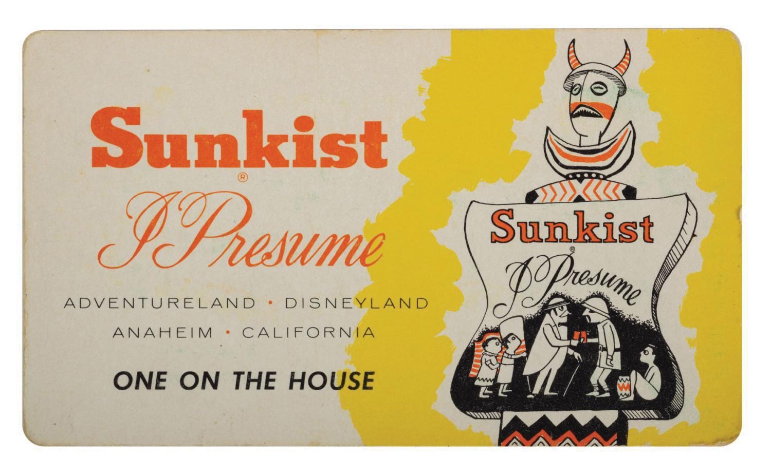(Disneyland, c.1962-70s) An early Sunkist beverage redemption ticket. The ticket would have enabled the redemption of one Sunkist Lemonade or Sunkist Pure Orange Juice from the bars at the Sunkist I Presume or Sunkist Citrus House refreshment locations at Disneyland. Measuring approximately 2.25"x4", the card displays in very good condition, exhibiting only minor wear and a few small spots of discoloration.