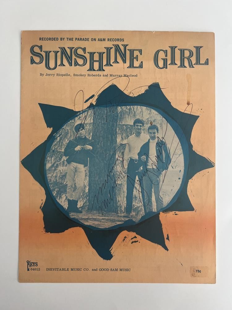 Sunshine Girl The Parade signed sheet music autographed by Jerry Riopelle, Smokey Roberds and Murry Macleod.
