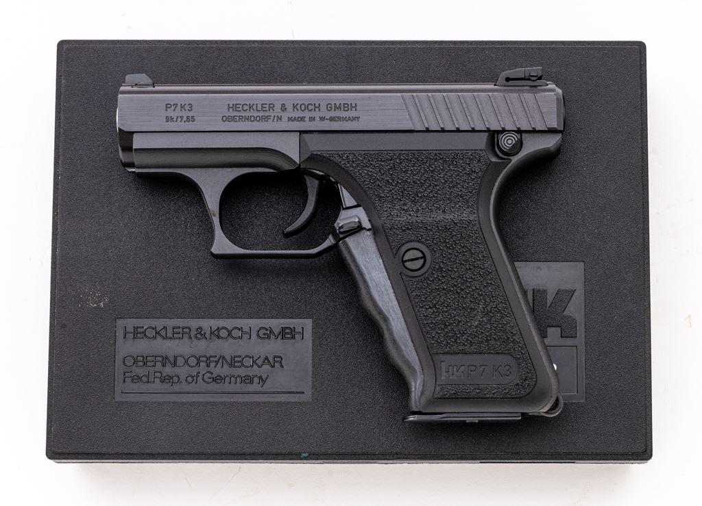 Superb Heckler & Koch P7 K3 Semi-Automatic Pistol, #USA-1321, .380 ACP cal., 3.8" barrel, matte black finish, textured black polymer grips. White-dot sights include a blade front and square-notched rear. Pistol also features squeeze-cocking lever on front of grip frame and ambidextrous magazine release. With two (2) 8-rd. H&K magazines. In original matching numbered black plastic case with owner's manual, and original tool. Mfg'd 1989 (IK). This pistol appears like new, and the overall condition would be hard to improve upon. Approx. 99%+ original factory metal finish remains. There is one faint and small blemish to the finish at the upper right edge of the slide, near the front sight, which is very minor and detracts little. Factory lettering is crisp. Grips are like new and show no handling wear. Bore is mirror bright. This pistol shows little evidence of use and is possibly unfired. A hard-to-find collector grade P7 K3 pistol. $3,500-$5,000. (Modern/PPT)