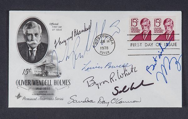 [supreme Court] FDC Signed By Seven Justices. First Day Cover honoring Justice Oliver Wendell Holmes, signed by the following: Thurgood Marshall, Lewis Powell, Byron R. White, Samuel A. Alito, John Paul Stevens, Sandra Day O'Connor, and Stephen Breyer. The cover is cancelled 14 June 1978 at Boston, MA. Very fine.