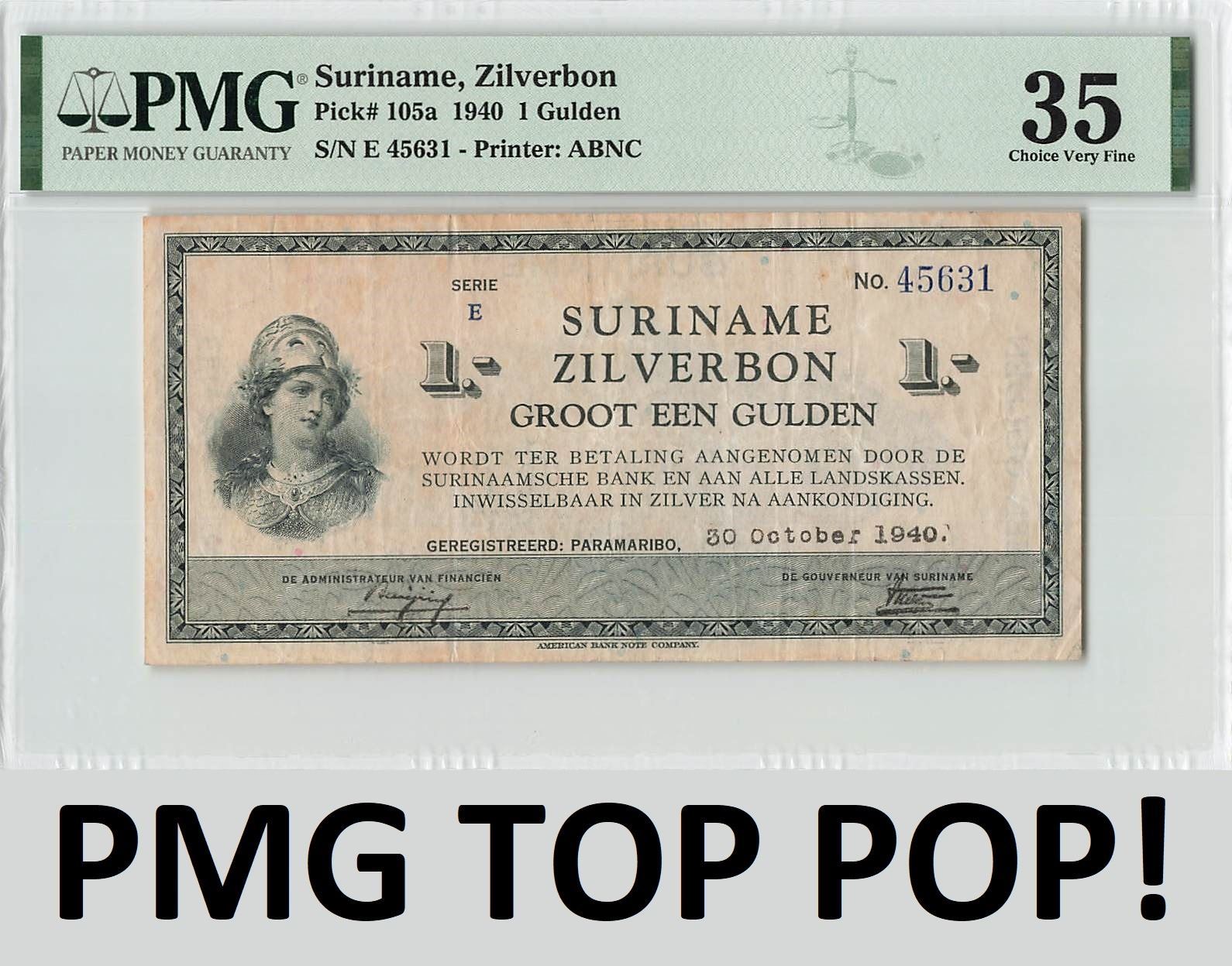 Suriname 1 Gulden 1940 ABNC 30.04.1940 Pick 105a PMG Choice Very Fine 35 TOP POP