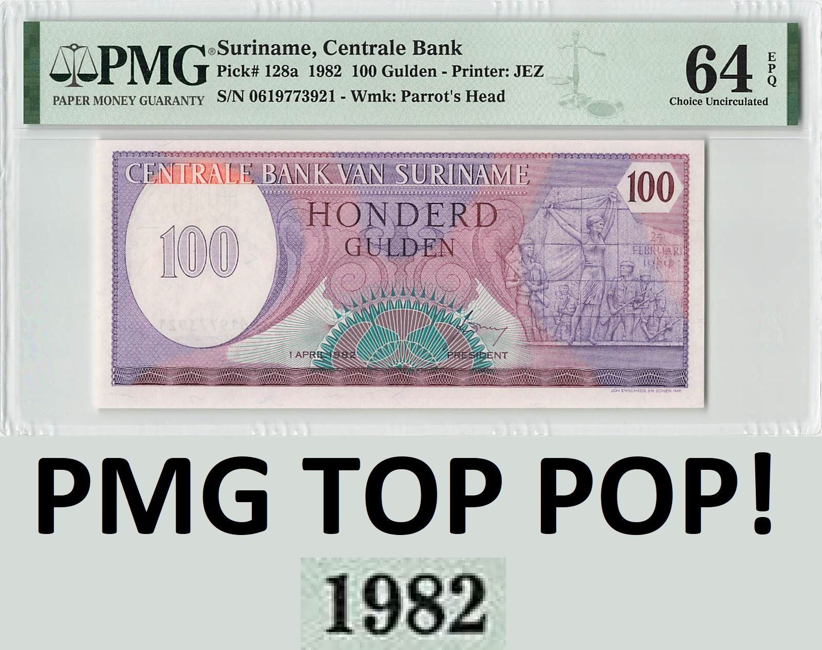Suriname 100 Gulden 1982 JEZ Pick 128a PMG Choice UNC 64 EPQ TOP POP