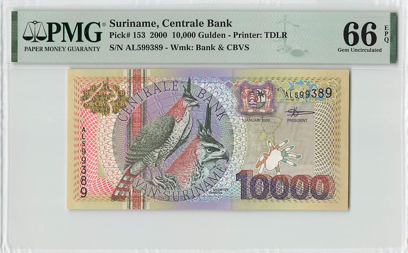 Suriname 10000 Gulden 2000 TDLR Pick 153 PMG Gem Uncirculated 66 EPQ