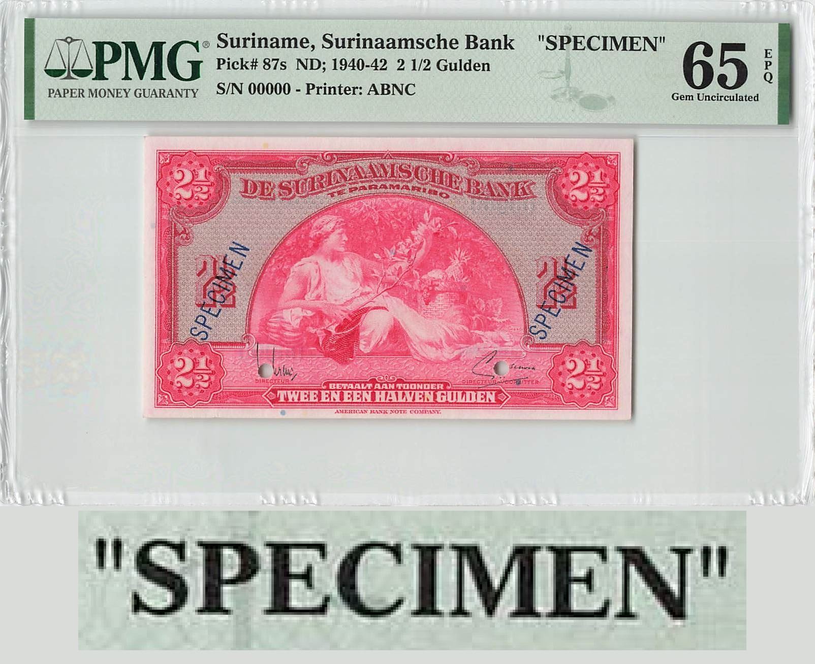 Suriname 2½ Gulden 1942 Specimen ABNC Pick 87s PMG Gem UNC 65 EPQ