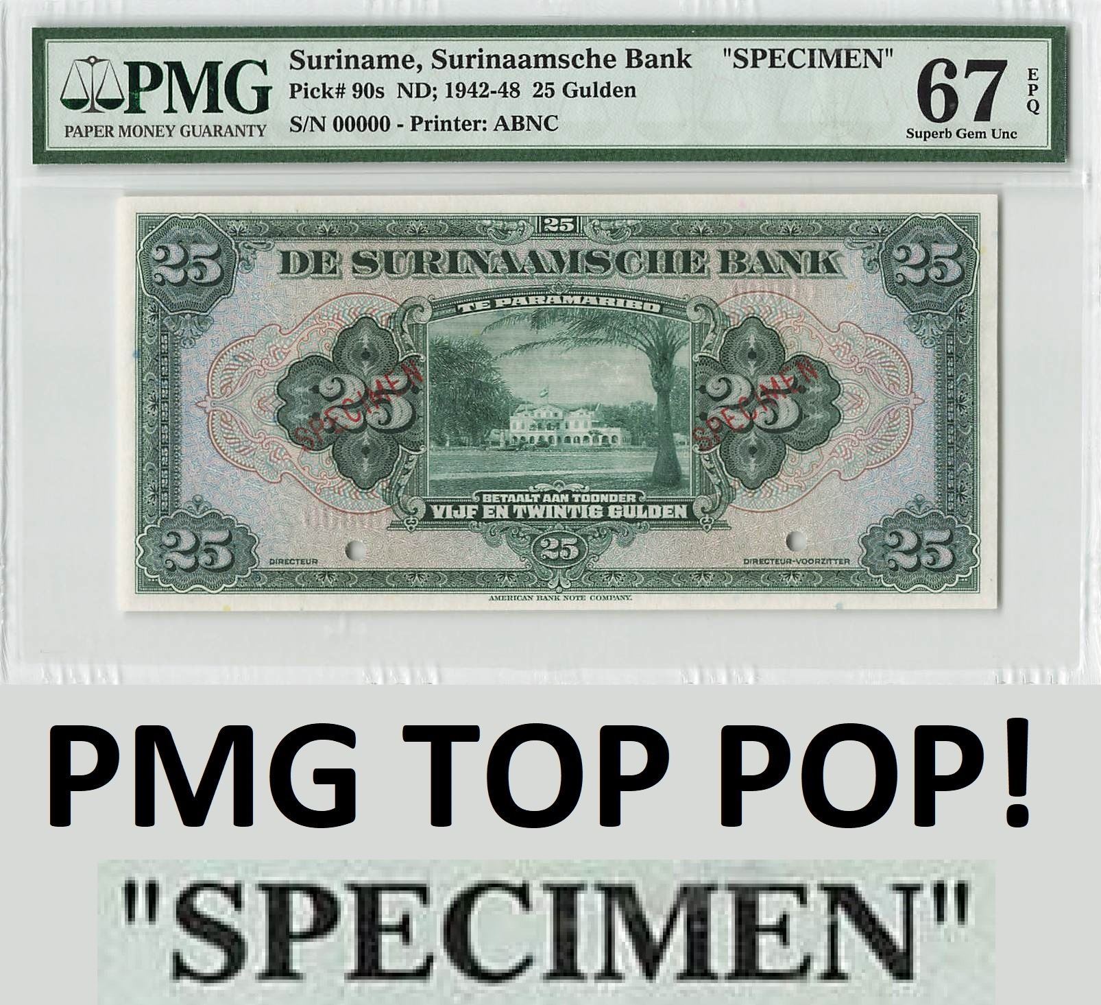 Suriname 25 Gulden 1942 - 1948 Specimen Pick 90s PMG Superb Gem Uncirculated 67 EPQ TOP POP