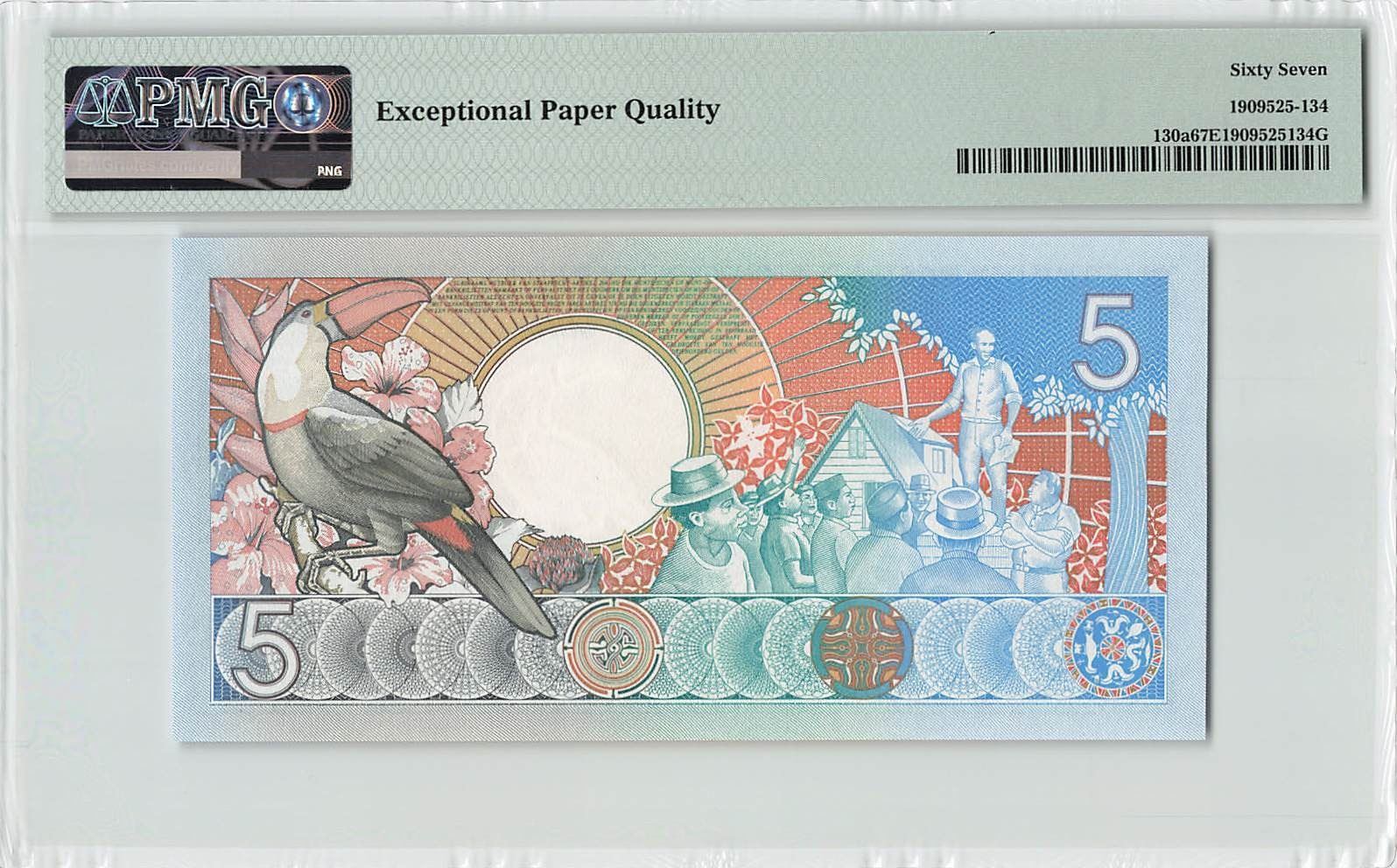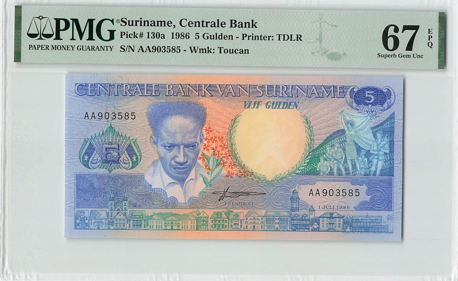 Suriname 5 Gulden 1986 TDLR Pick 130a PMG Superb Gem UNC 67 EPQ