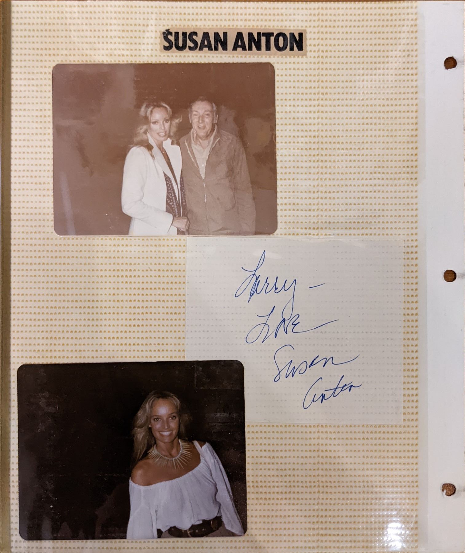 Susan Anton Original Photo Album Page and Signature Cut. From backstage at the Merv Griffin Show. 1980's. 9x11 inches All of these pictures were taken backstage and are one of a kind photos with no copies made