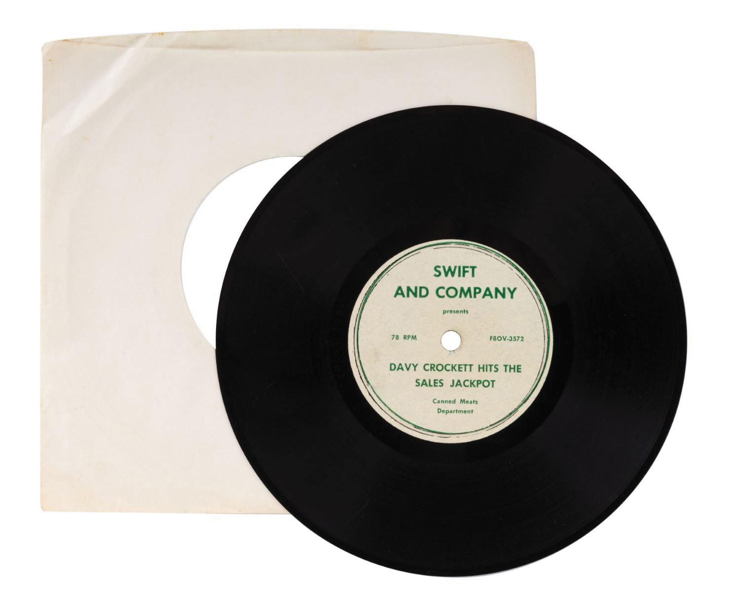 (Disneyland, c.1954-55) A "Davy Crockett Hits the Sales Jackpot" 78 rpm record advertising the corporate synergy between the popular Walt Disney series Davy Crockett, Disneyland, and Park sponsor Swift & Co. The record capitalized on the Crockett-craze by creating a new version of George Bruns' popular song with custom lyrics that sung the praises of both Davy Crockett and Swift's. Measuring approximately 7" in diameter, the double-sided 33 1/3 record plays in very good condition with only minor scratches and slight wear to the label.