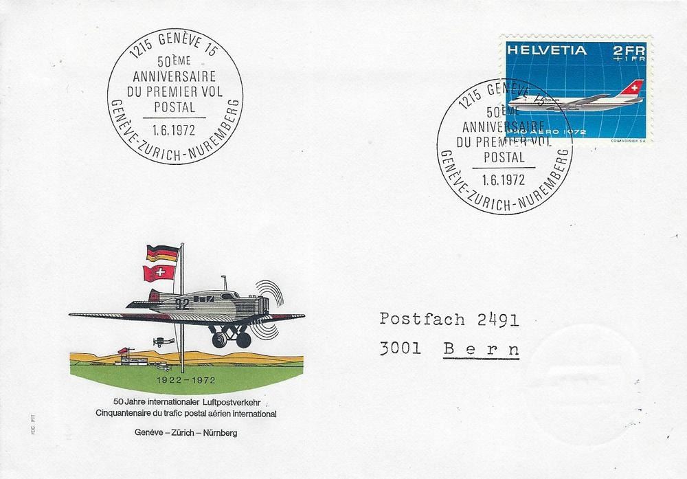 Swiss - First Day Cover - 1215 Geneve 15 - Geneve-Zurich-Nuremberg - 50 eme Anniversaire Du Premier Vol Postal - 1. 6. 1972