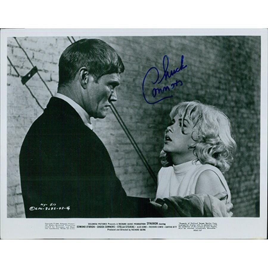 Chuck Connors Synanon 8x10 glossy finish promo photo signed in blue sharpie. The signature has some scuffing to it. This item has been certified by James Spence Authentication (JSA) with sticker affixed to item on the back and matching card.