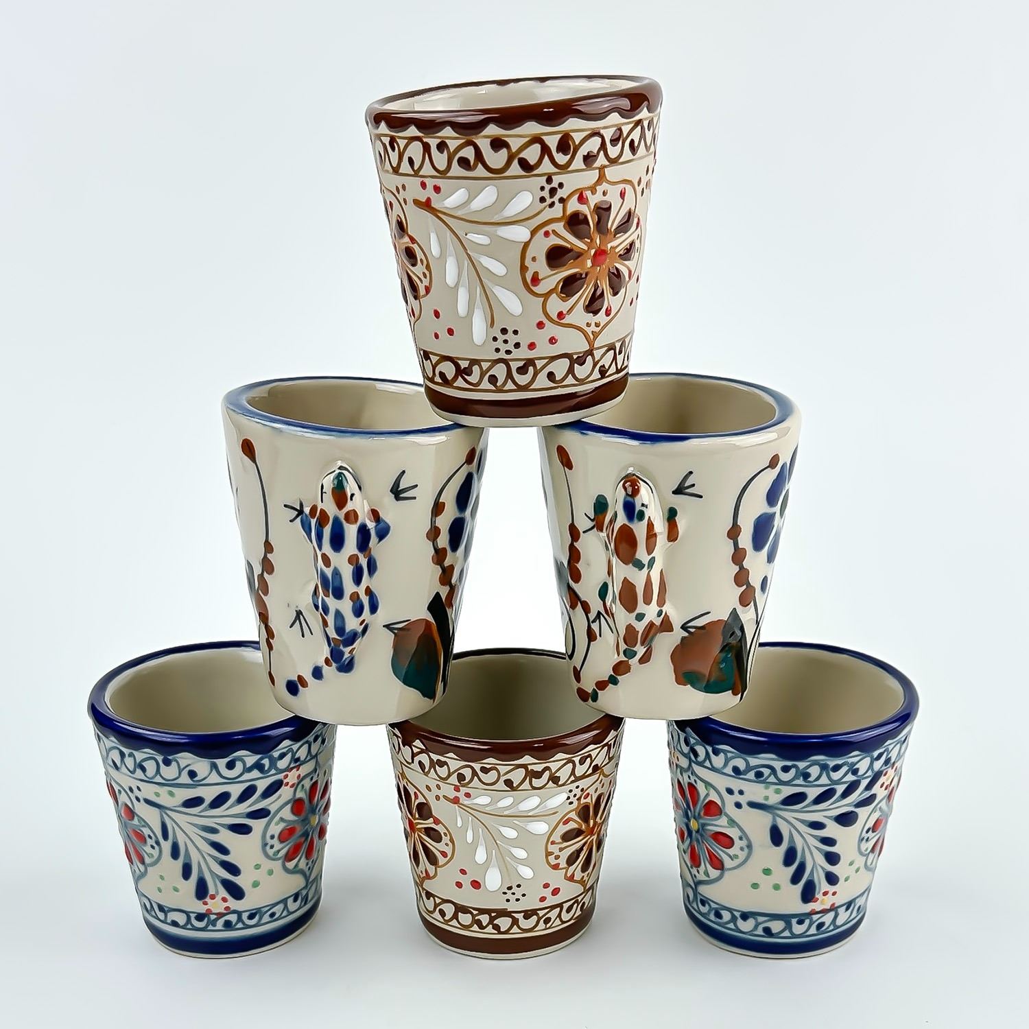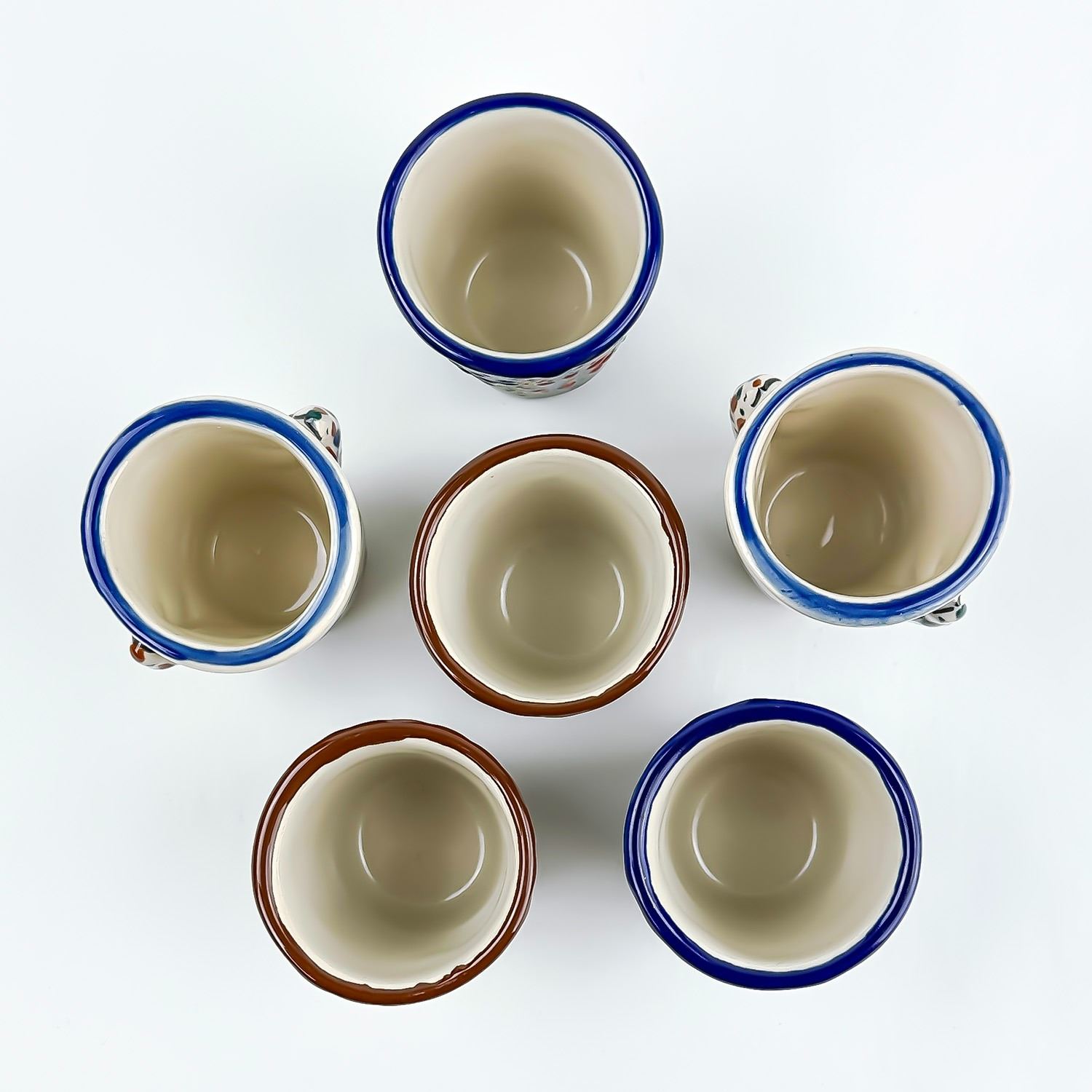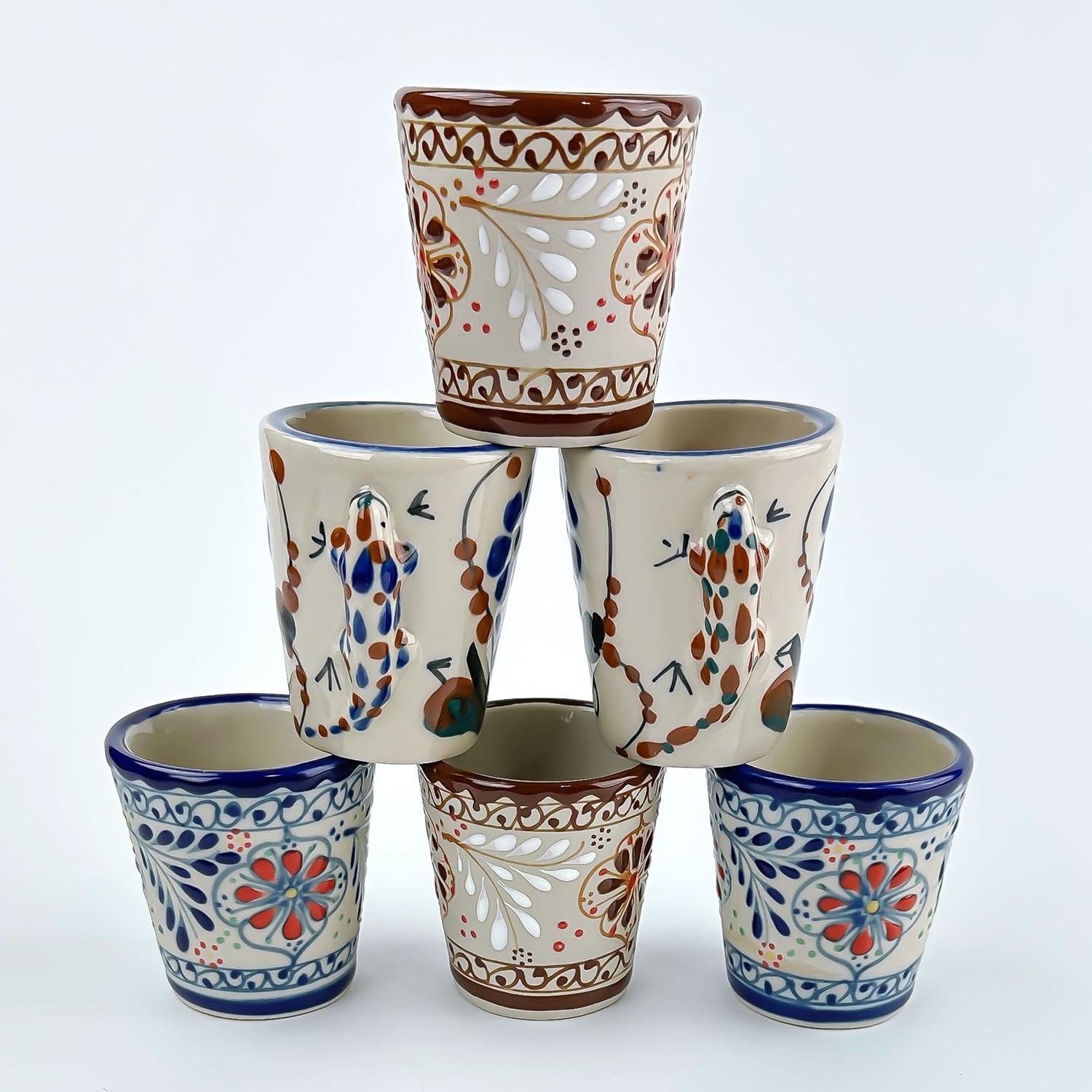 #8618 - LOT OF 6 TALAVERA OR TALAVERA STYLE ART POTTERY SHOT GLASSES - MADE IN MEXICO. THERE ARE 2 BROWN, 2 BLUE AND 2 WITH LIZARD SHAPED HANDLES. THESE HAND-CRAFTED COLLECTIBLE ALCOHOL BARWARE SHOT GLASSES ARE FREE OF CRACKS, CHIPS AND REPAIRS - THEY LOOK GREAT! THE SHORT GLASSES MEASURE 2.25” (6 CM) TALL AND THE TALLER LIZARD HANDLED ONES ARE 2.5” (6.5 CM) TALL.