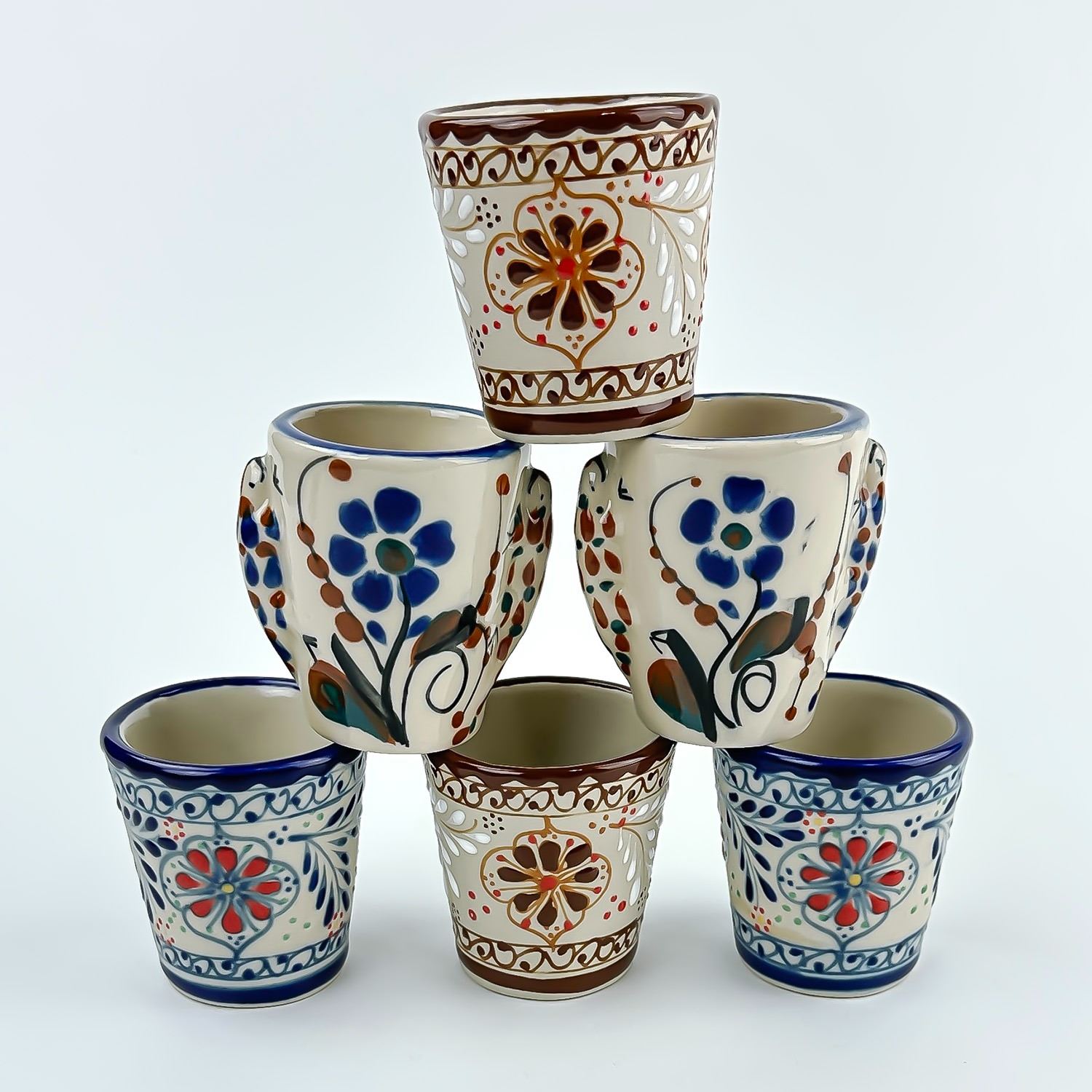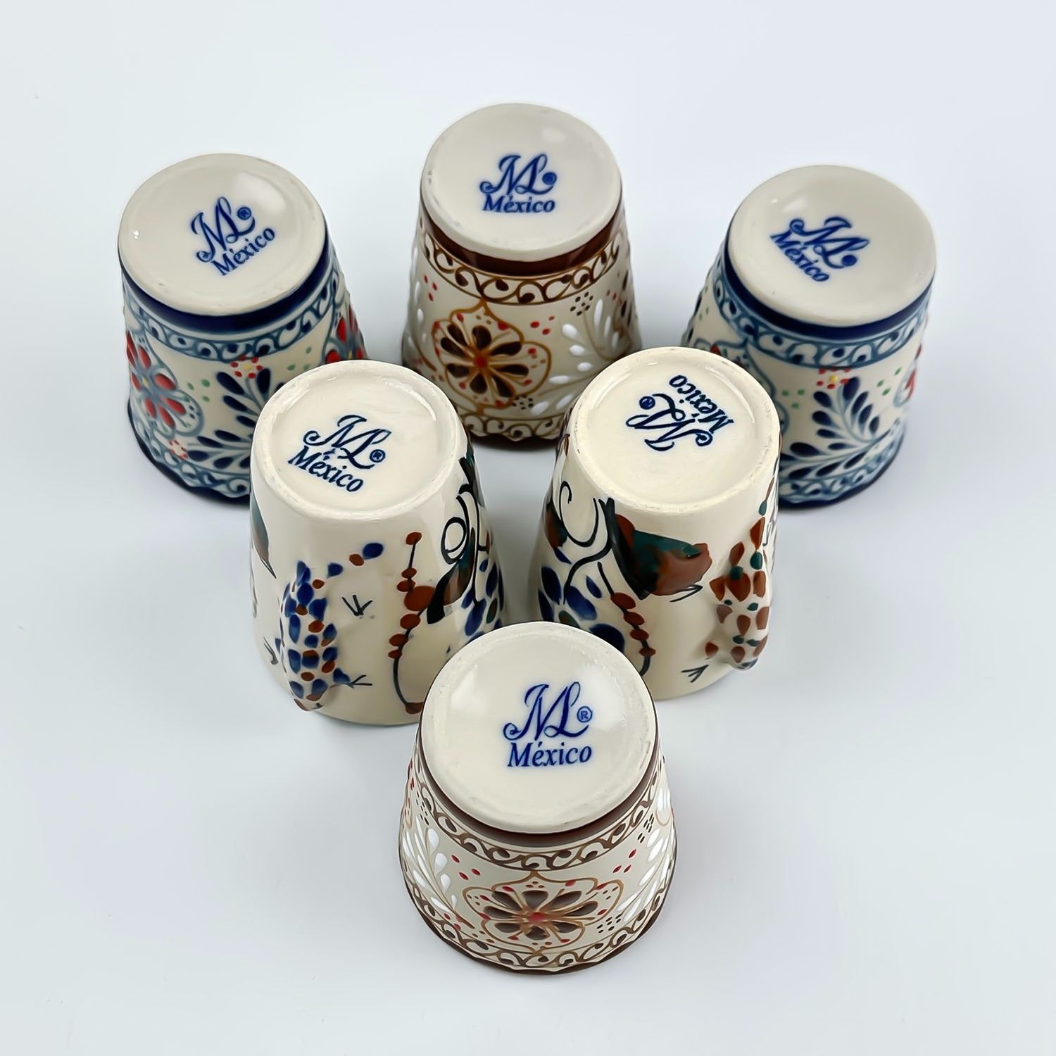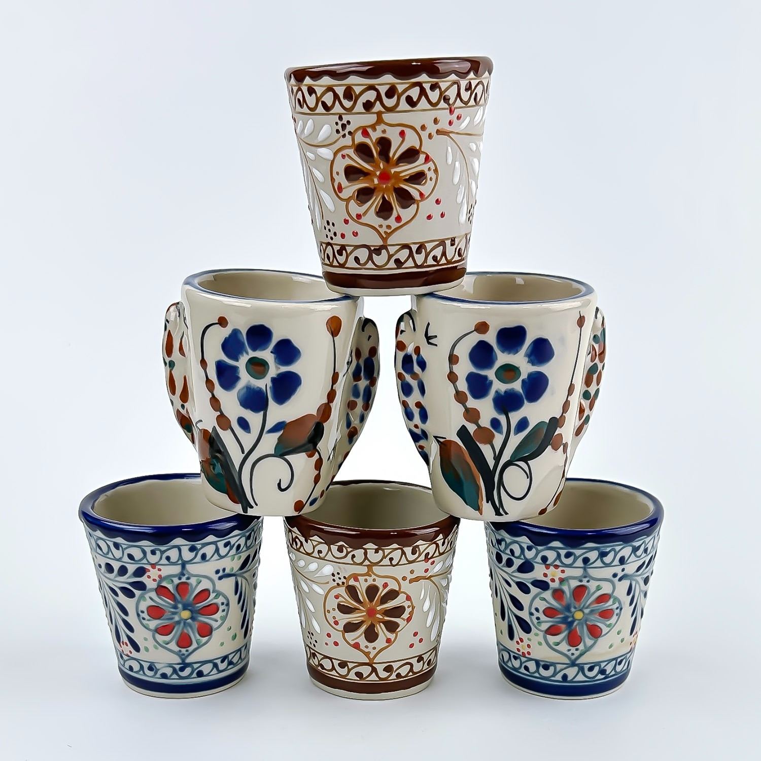 #8618 - LOT OF 6 TALAVERA OR TALAVERA STYLE ART POTTERY SHOT GLASSES - MADE IN MEXICO. THERE ARE 2 BROWN, 2 BLUE AND 2 WITH LIZARD SHAPED HANDLES. THESE HAND-CRAFTED COLLECTIBLE ALCOHOL BARWARE SHOT GLASSES ARE FREE OF CRACKS, CHIPS AND REPAIRS - THEY LOOK GREAT! THE SHORT GLASSES MEASURE 2.25” (6 CM) TALL AND THE TALLER LIZARD HANDLED ONES ARE 2.5” (6.5 CM) TALL.
