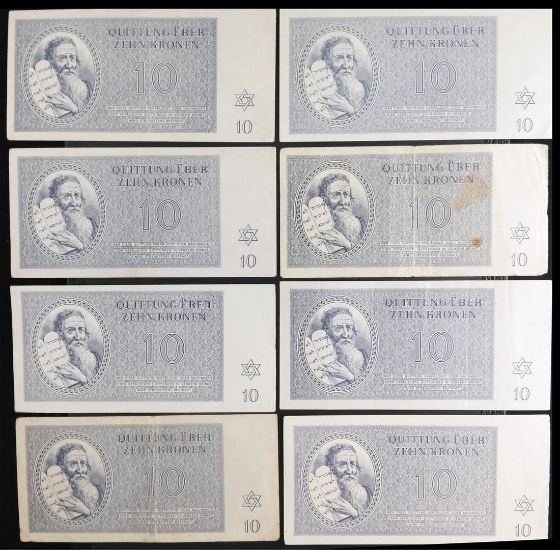 Collection showing the numerous different plate numbers used on the 10Kr notes, includes nine (9) 10KR notes showing plates A001, A003 (2), A007, A011, A017, A018, A020 and A027, generally sound and Fine to About Uncirculated.